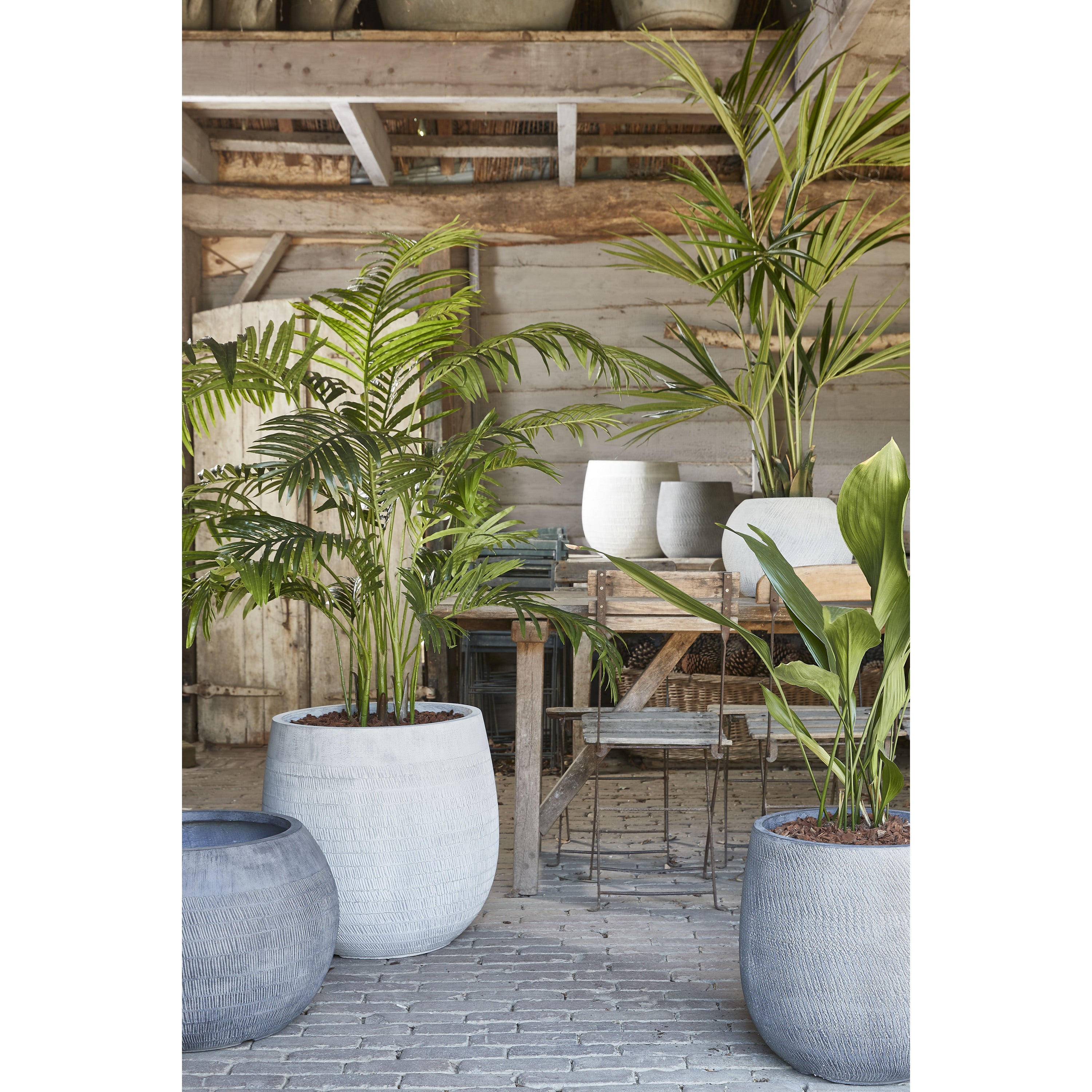 - De kenmerkende palmbladeren brengen een botanische sfeer in huis