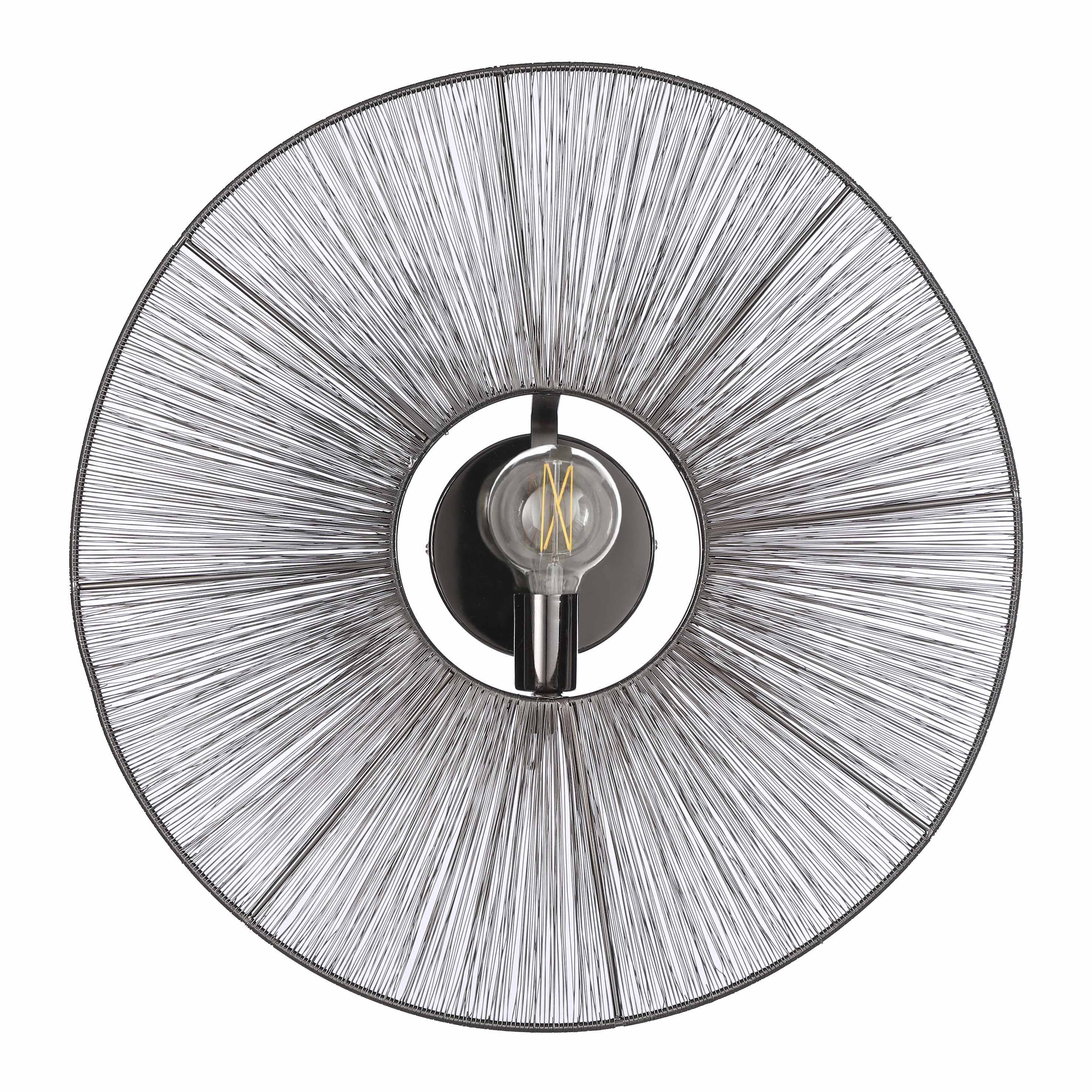 Met de Bodil wandlamp van Mica Decorations haal je niet alleen sfeervolle verlichting in huis, het is ook gelijk een mooi decoratie item voor aan de muur! Om de lamp zit namelijk een ronde krans van gespannen metaaldraadjes. Zo breng je bijna letterlijk het zonnetje in huis, maar dan in een stoere, zwarte kleur. De Bodil lampen zijn verkrijgbaar in meerdere kleuren en maten. Leuk om met elkaar te combineren! Dit model heeft een diameter van 60 cm en komt 18 cm van de muur af. De lamp voor aan de muur is geschikt voor een E27 lichtbron van maximaal 25 Watt.