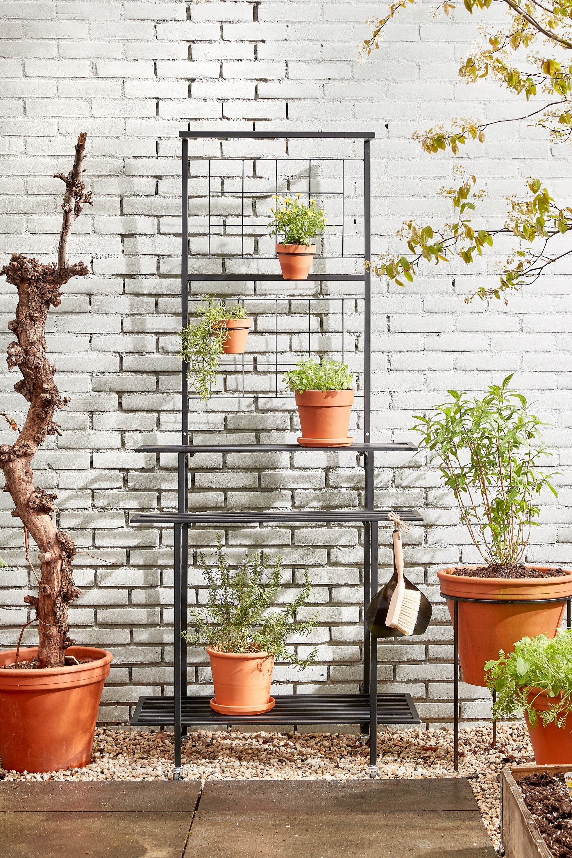 In je tuin, op je balkon of zelfs op je daktuin, met de Greenrax plantenstandaard van Mica Decorations maak je het overal gezellig! Op de stoere, industriële plantenstandaard kun je planten op vier hoogtes zetten. Hierdoor is er alle ruimte om mooie planten in bloempotten neer te zetten, maar kun je ook een handschep, handhark en een hangplant ophangen. Hij heeft vier wieltjes waardoor je hem makkelijk kunt verplaatsen. De plantenbakken en -artikelen van Greenrax kun je perfect met elkaar combineren op elk oppervlakte. Deze plantenstandaard heeft een lengte van 90 cm, een breedte van 44 cm en een hoogte van 190 cm. Tussen de onderste verdieping en de middelste verdieping zit een ruimte van 64,5 cm en tussen de middelste verdieping en de bovenste verdieping zit een ruimte van 20,5 cm.