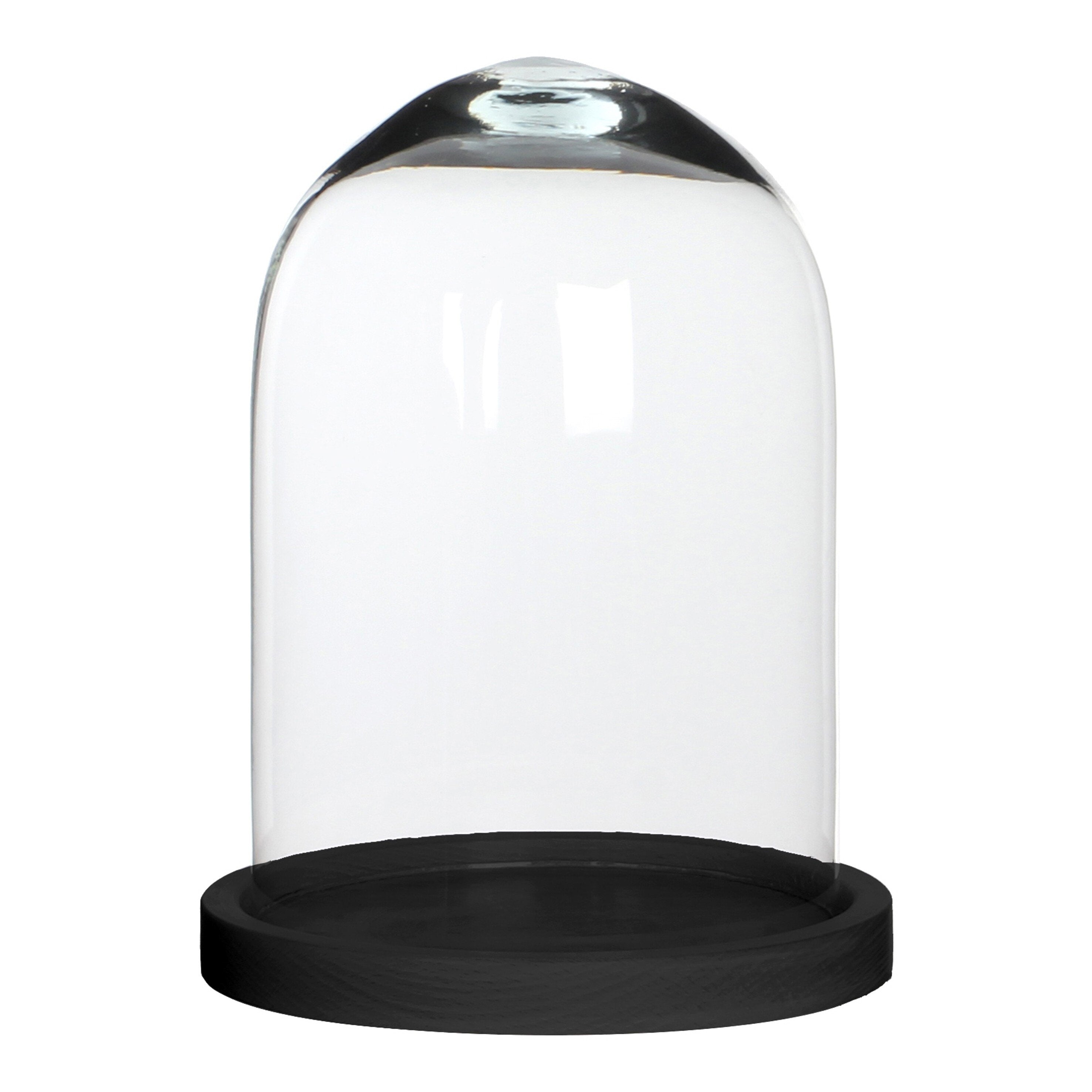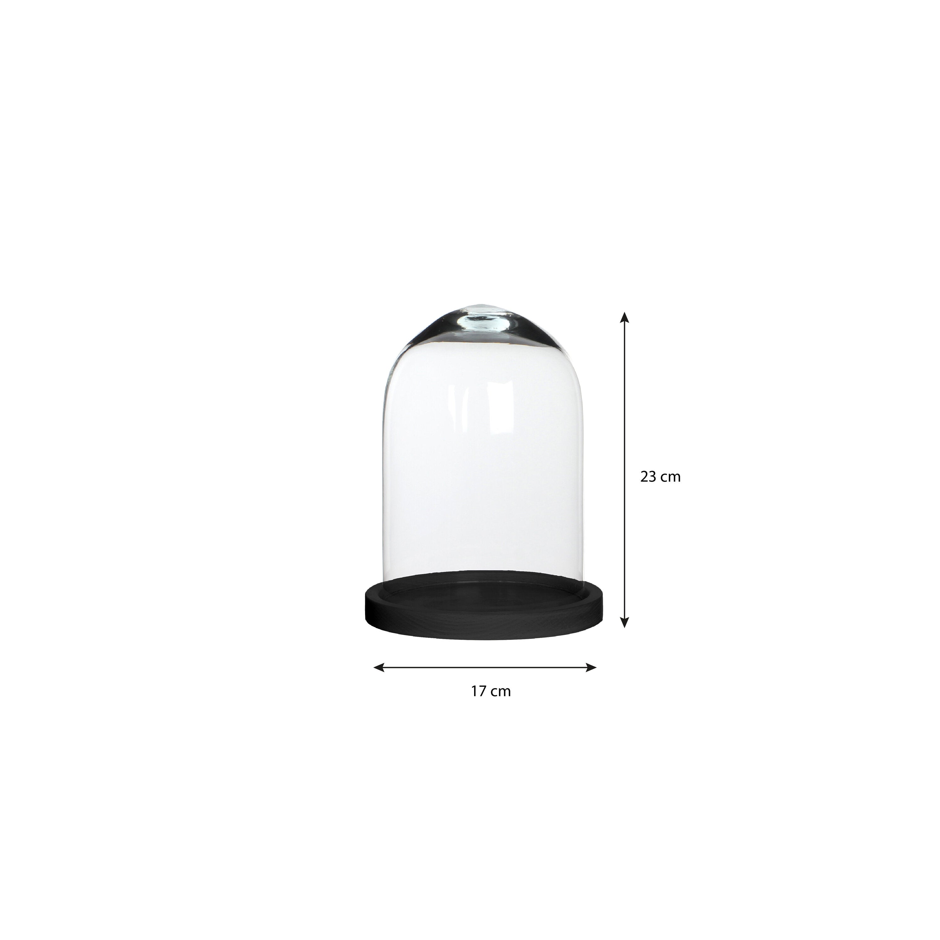 Glazen decoratie stolp op zwart houten plateau 17 x 23 cm. Decoratieve glazen stolp van helder glas met afgeronde bovenkant en een eikenhouten plateau. Presenteer uw mooiste snuisterijen onder deze transparante stolp. Afmetingen: Diameter plateau