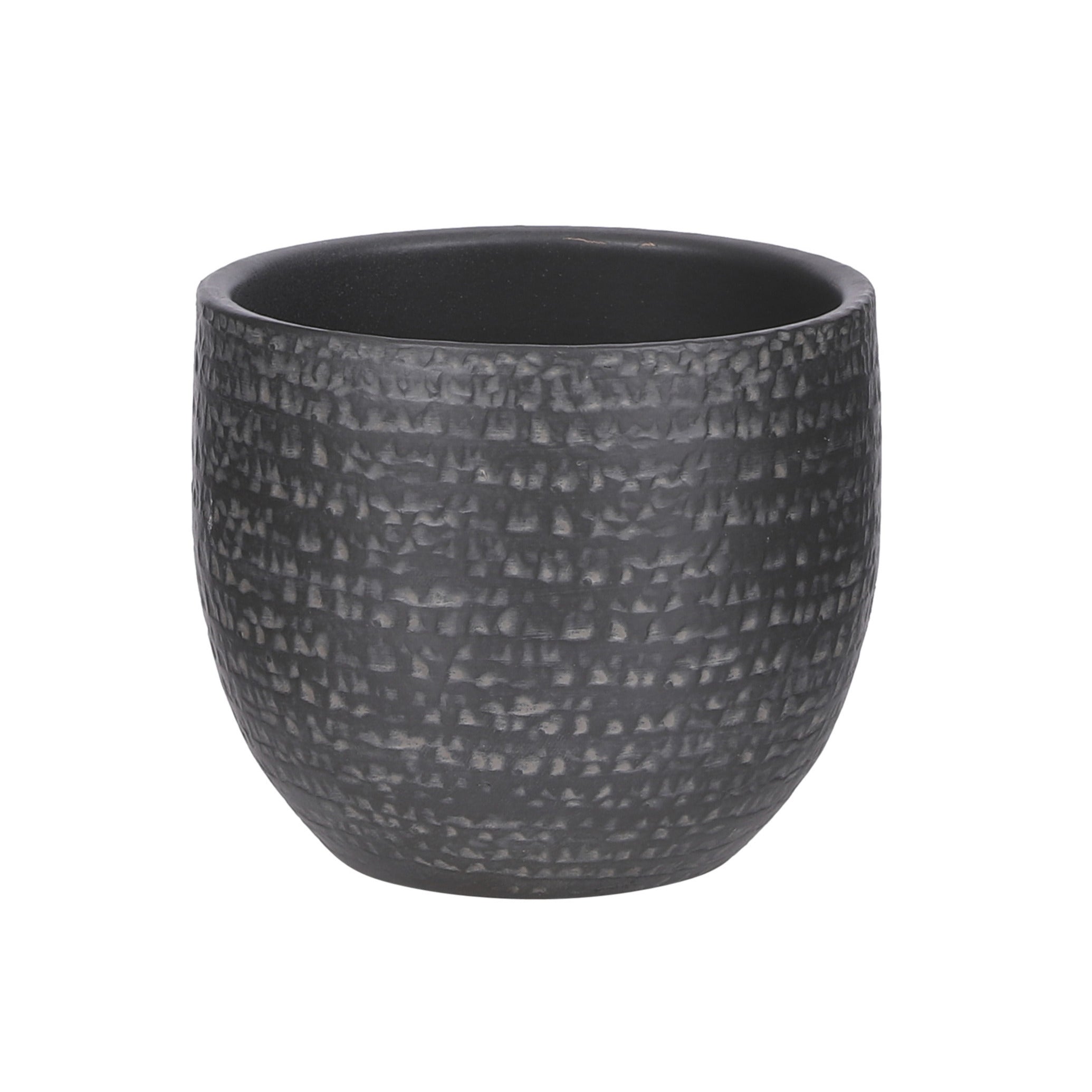 Plantenpot/bloempot van terracotta in de kleur zwart/grijs met een modern relief flakes patroon. Stijlvolle bloempotten voor binnen gebruik. Serie: Carrie. De zeer mooie potten met prachtige buitenzijde zijn met de hand gemaakt in Portugal. Derhalve is geen pot exact hetzelfde en hebben de bloempotten een echt karakter. Materiaal: Terracotta. Tip: zet een schotel onder de pot om eventueel lekken tegen te gaan. Potten van steen zijn niet 100% waterdicht. Afmeting: ca. D14 x H12 cm.