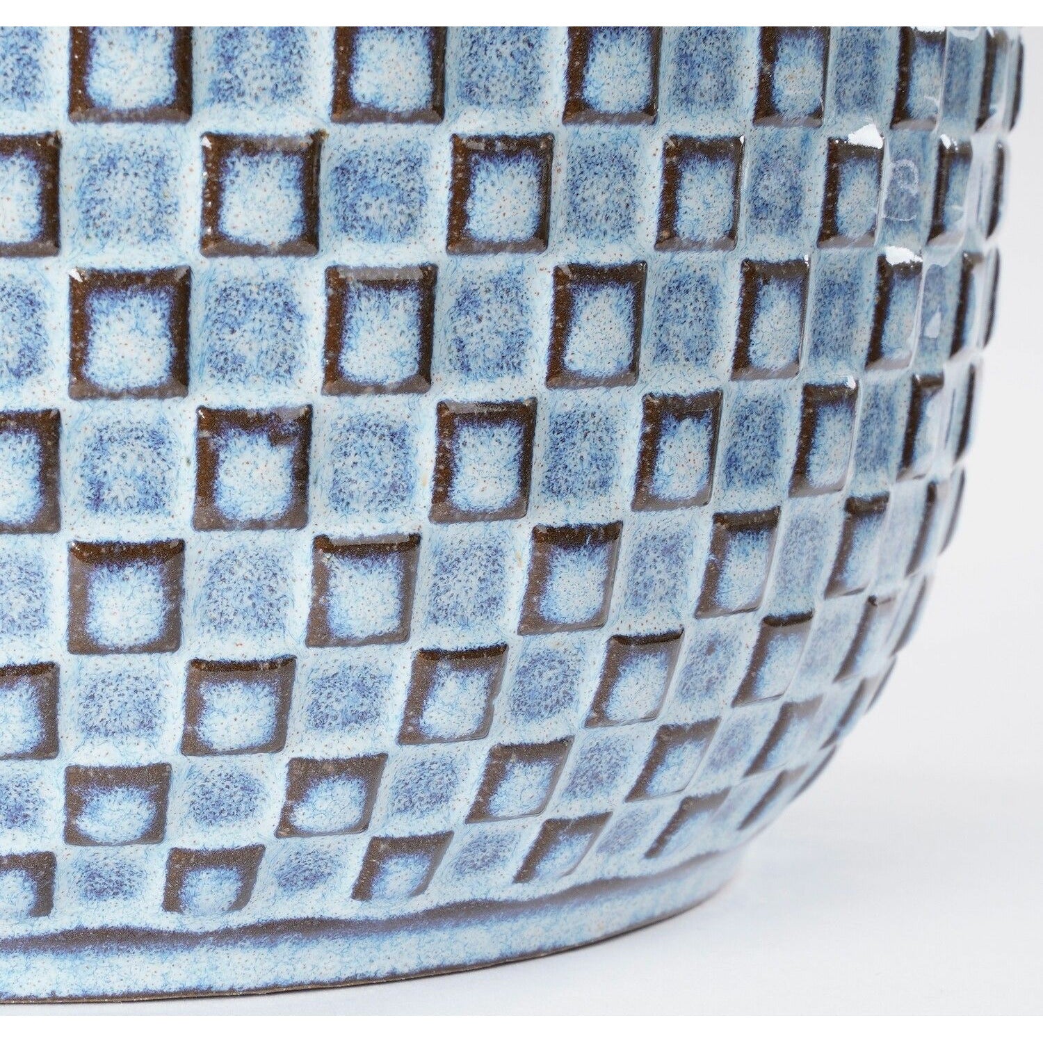 Plantenpot/bloempot van keramiek in de kleur blauw met een mooi patroon. Diameter 13.5 cm en hoogte 13 cm. Stijlvolle bloempotten voor binnen gebruik met een glanzende finish. Serie: Daan. Het vierkantjes patroon aan de buitenzijde van de pot geeft het geheel een modieus fraai stijlvol uiterlijk. Handgemaakt keramiek.