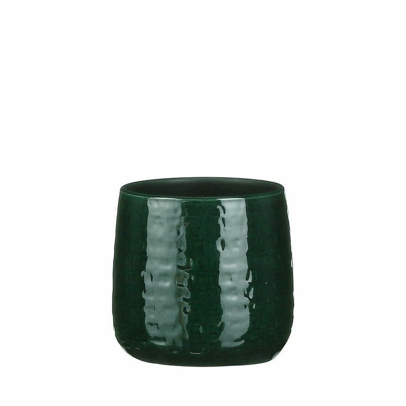 Plantenpot/bloempot van keramiek in de kleur donkergroen met een mooi relief patroon. Diameter 15 cm en hoogte 13 cm. Stijlvolle bloempotten voor binnen gebruik met een glanzende finish. Serie: Floyd. Het prachtige gedrukte patroon aan de buitenzijde is met de hand gemaakt in Portugal. Derhalve is geen pot exact hetzelfde en hebben de bloempotten een echt karakter.