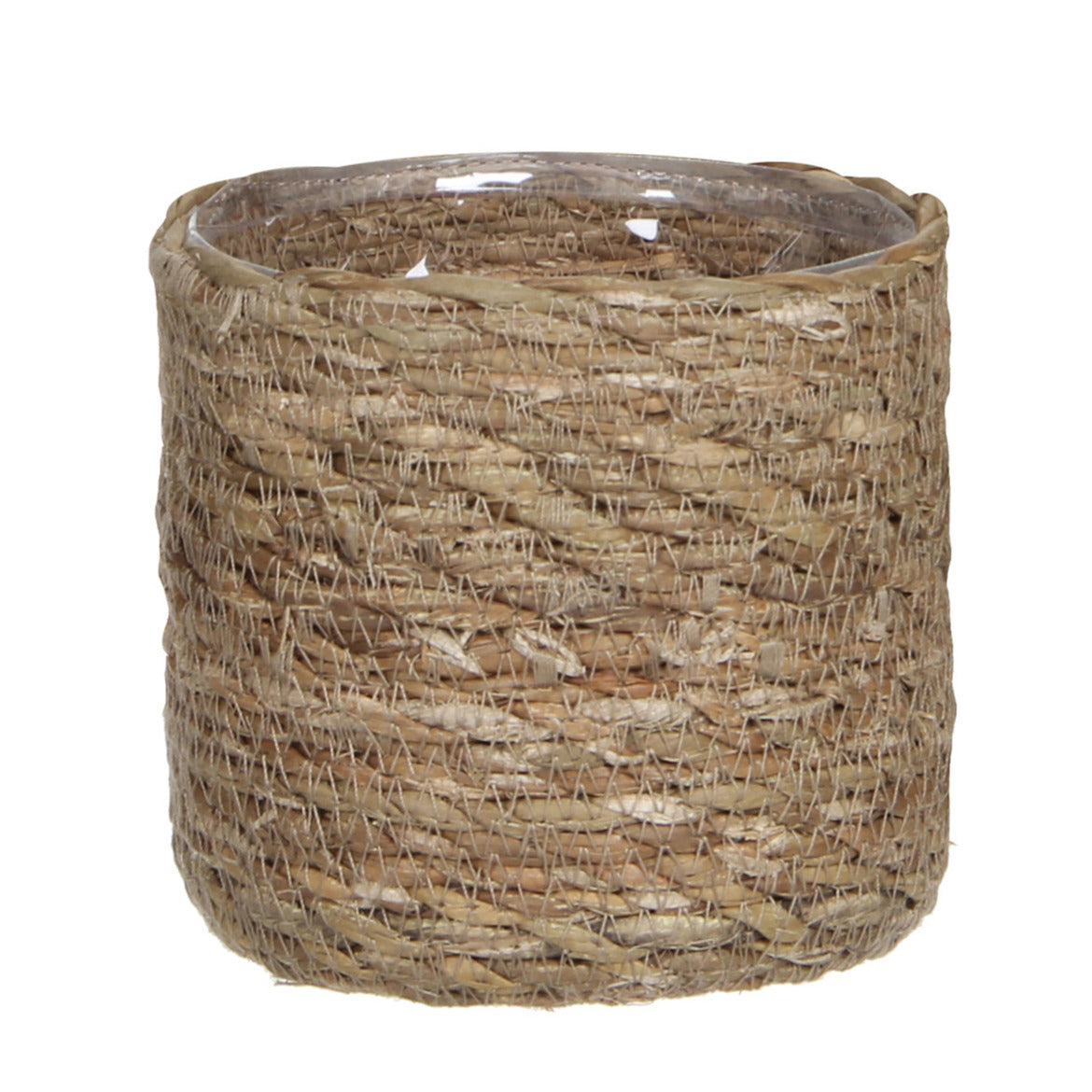 Naturel bruin kleur rotan planten pot mand van gedraaid jute/touw iet/zeegras van 12 cm hoogte en 12 cm diameter(buitenzijde). Voor de binnenmaat trek je 2 cm af. Mooie rotan jute manden/mandjes voor bloemen, bloemstukjes en planten met plastic aan de binnenkant zodat het water er niet door gaat. De ronde rieten mand heeft geen gaatjes aan de onderkant.