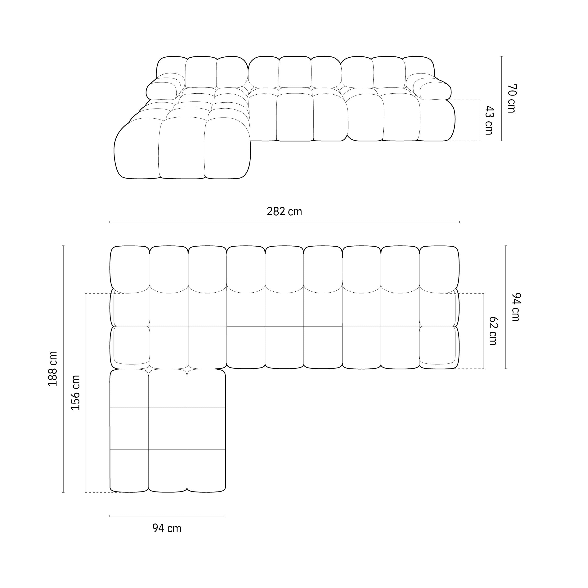 - Modulaire hoekbank met de afmetingen H 70 x B 282 x D 188/94 cm