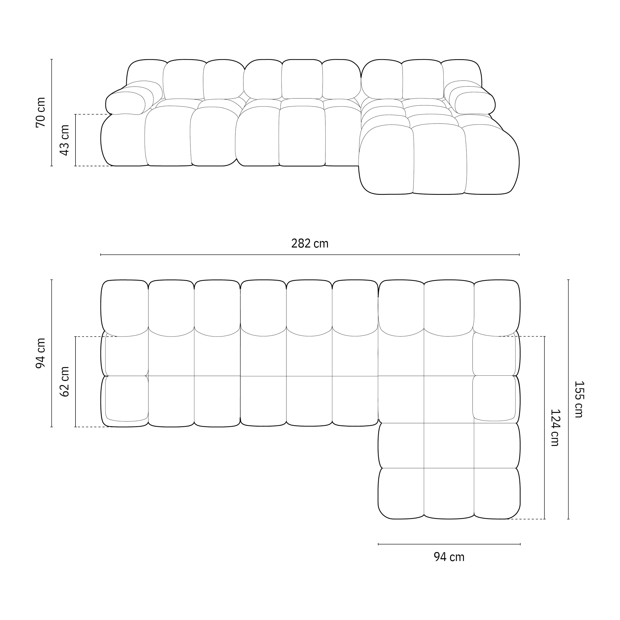 - Modulaire hoekbank met de afmetingen H 70 x B 282 x D 155/94 cm