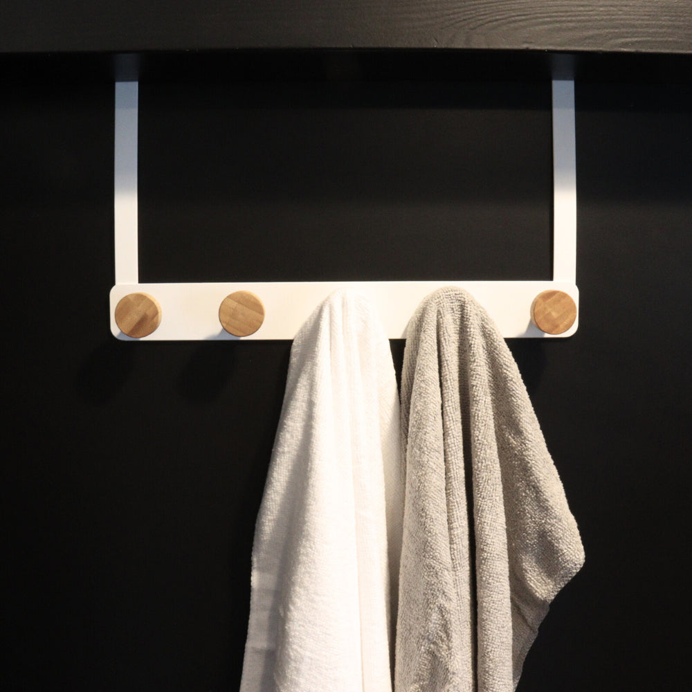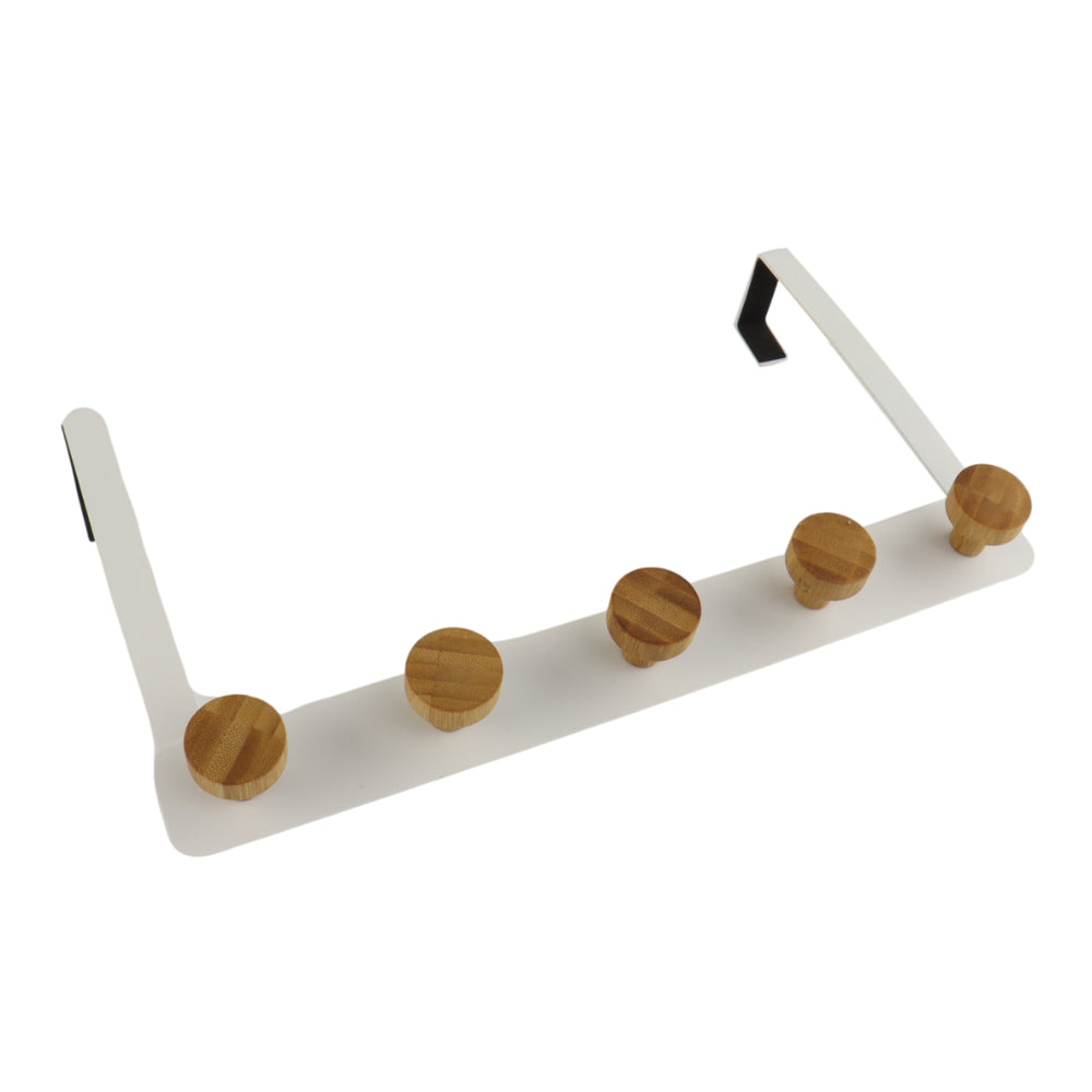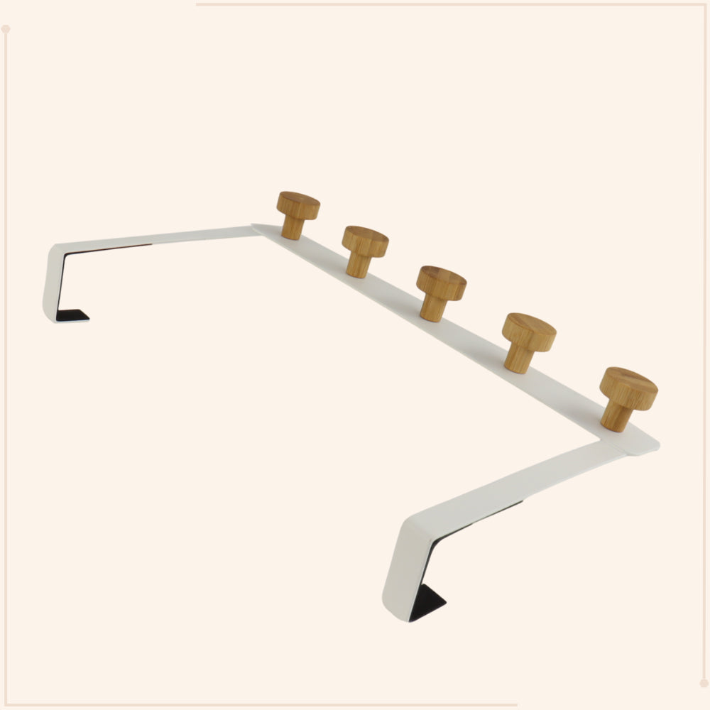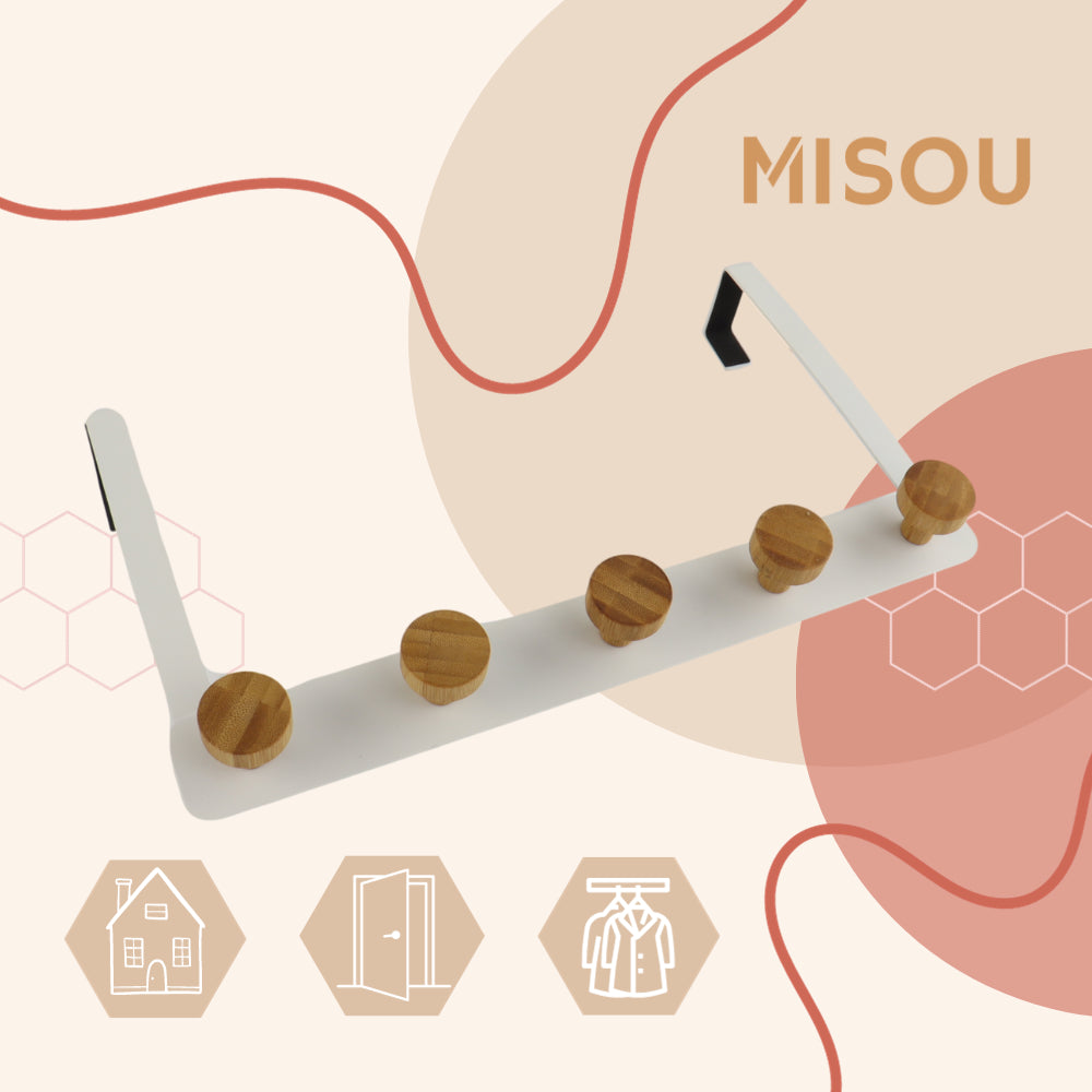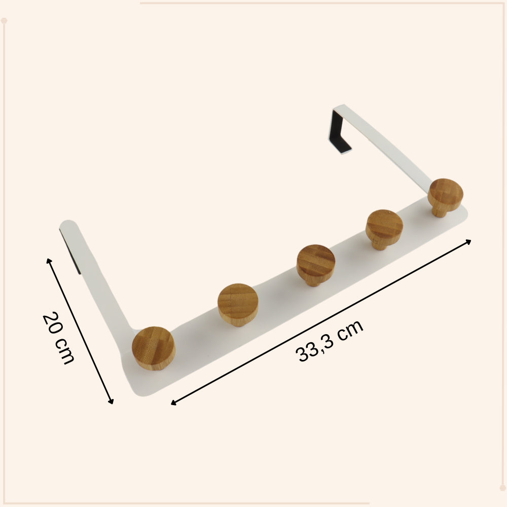 De MISOU kapstok is makkelijk op te hangen aan deuren. Er zitten vijf hangers aan om jassen of handdoeken aan te hangen. De haken zijn van bamboe en de kleur van de kapstok is wit. De afmetingen zijn: 33,3x8,2x20cm.