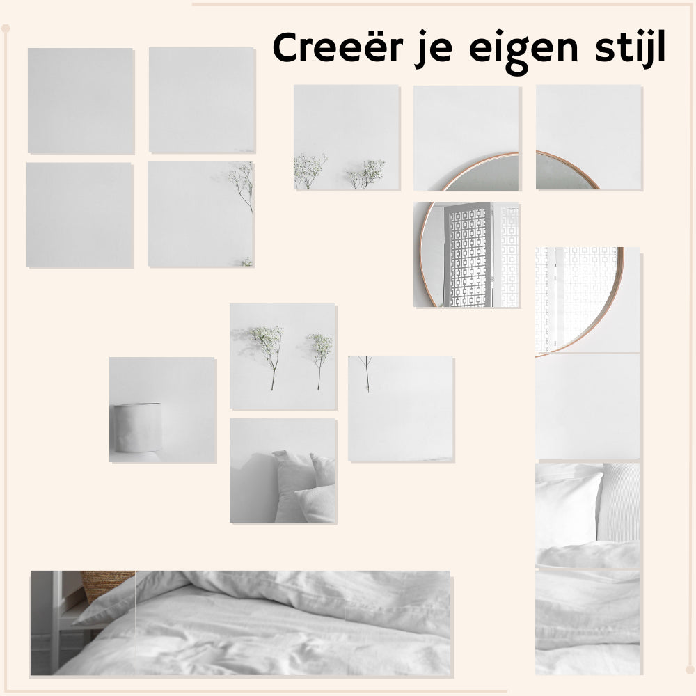 Upgrade je interieur met onze set van 4 vierkante plakspiegels! Met hun strakke en moderne design zijn deze spiegels perfect om een eigentijdse uitstraling aan elke kamer te geven. Dankzij de plakstrip zijn ze eenvoudig te bevestigen op verschillende oppervlakken, waardoor je eenvoudig een stijlvolle en decoratieve touch aan je woning kunt toevoegen.