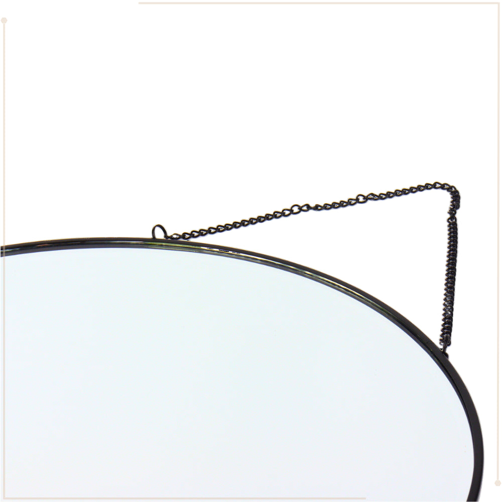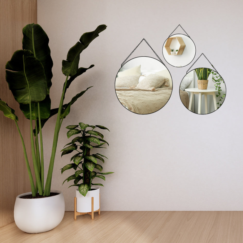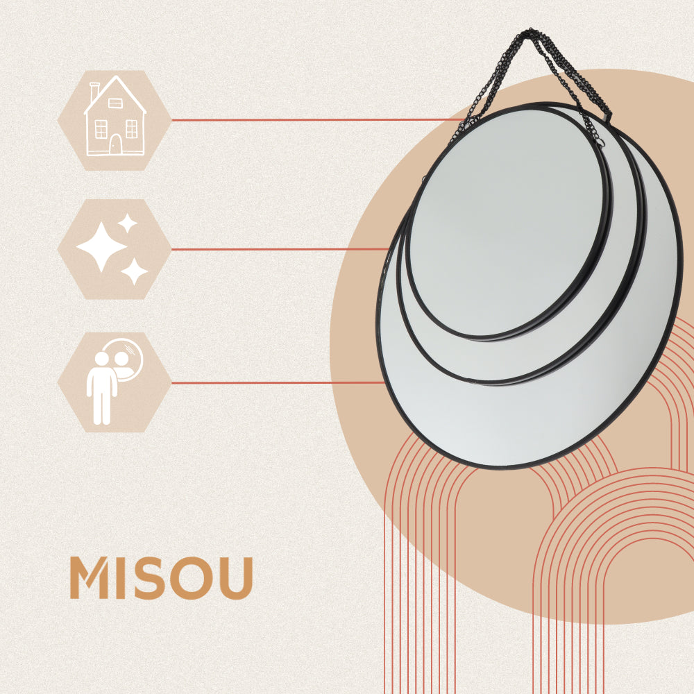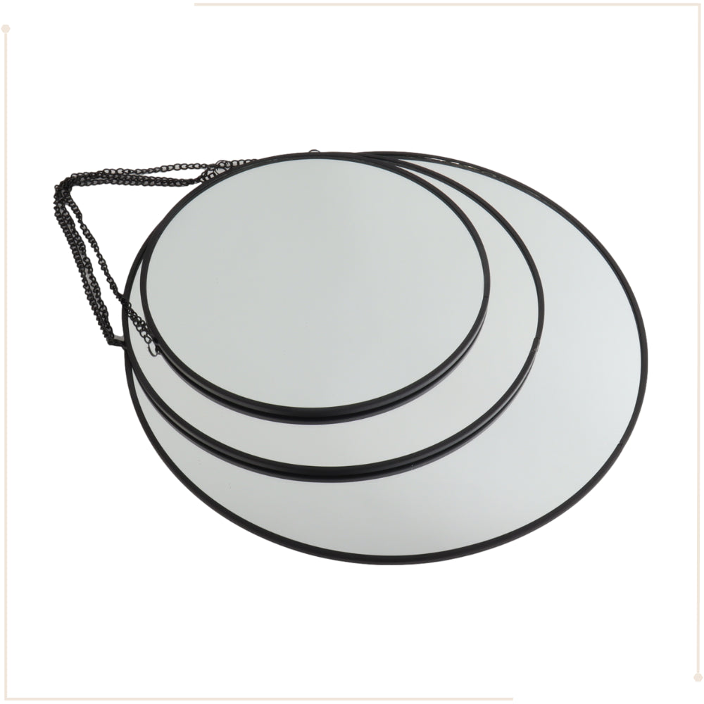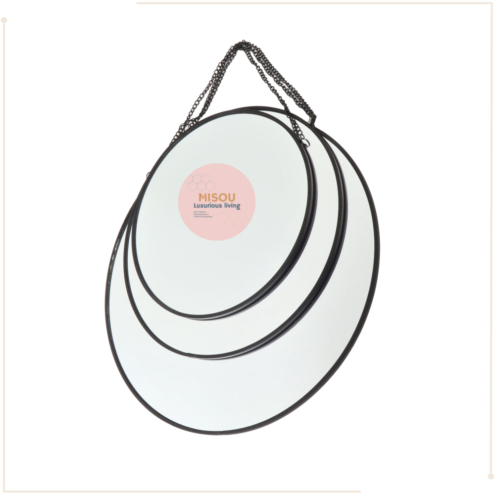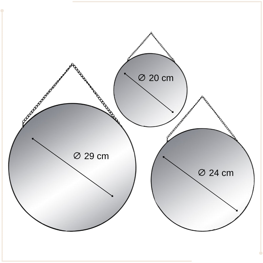 De MISOU spiegel set bestaat uit drie ronde spiegels. De grootste spiegel heeft een diameter van 29cm. De middelste maat heeft een diameter 24cm en de kleinste maat heeft een diameter van 20cm. Om de spiegel zit een zwarte rand en aan de boven kant een hangsysteem.