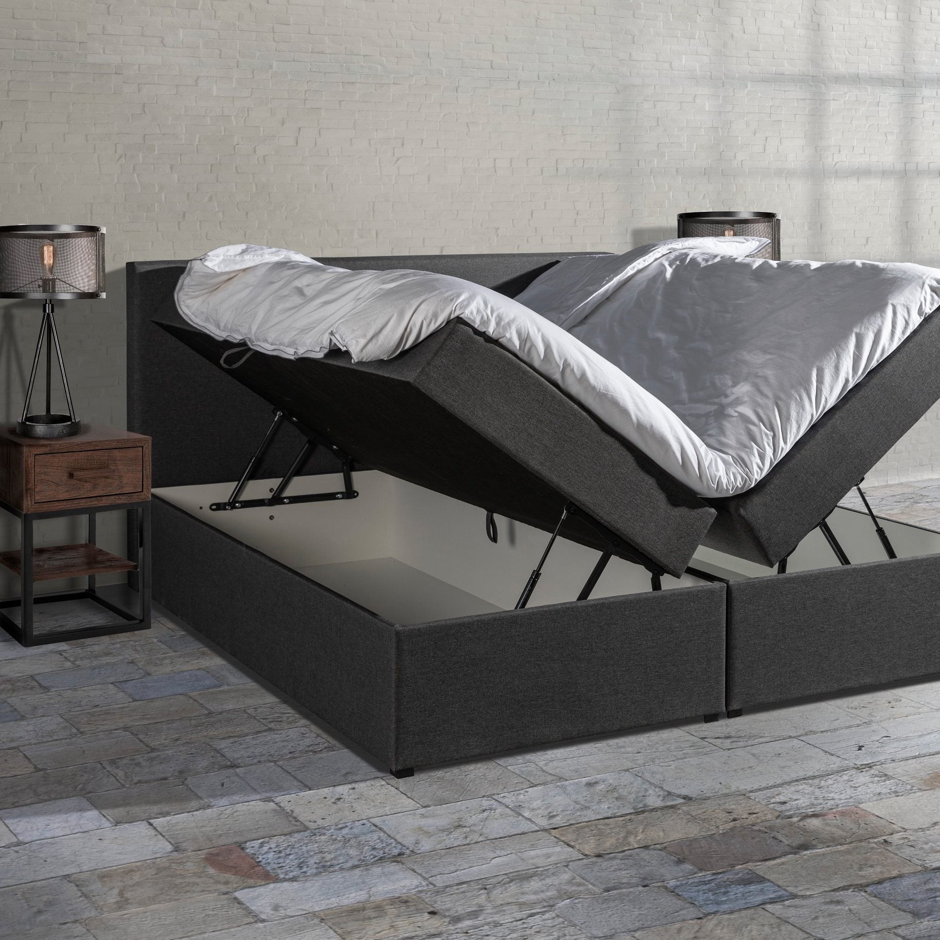 Unieke veertechniek De losse boxen en de opbergruimte deze boxspring wordt geleverd met 2 vlakke comfort boxen van ca. 30 cm hoog. En wat deze boxen zo bijzonder maakt, is de royale opbergruimte onder de matrassen. Normaal is dit een loze ruimte, maar deze boxspring is multifunctioneel! Het openen van de opbergruimte gaat erg makkelijk; door aan de stevige lus te trekken gaan de pocketveer matrassen zijwaarts omhoog, alsof hij zijn vleugels uitslaat. Door een unieke veertechniek blijft de boxspring goed openstaan. Het mechanisme is goed bestendig tegen intensief gebruik en zo heb jij letterlijk in een handomdraai een royale opbergruimte waar je van alles in kwijt kunt. Denk bijvoorbeeld aan je beddengoed, kleding en schoenen.