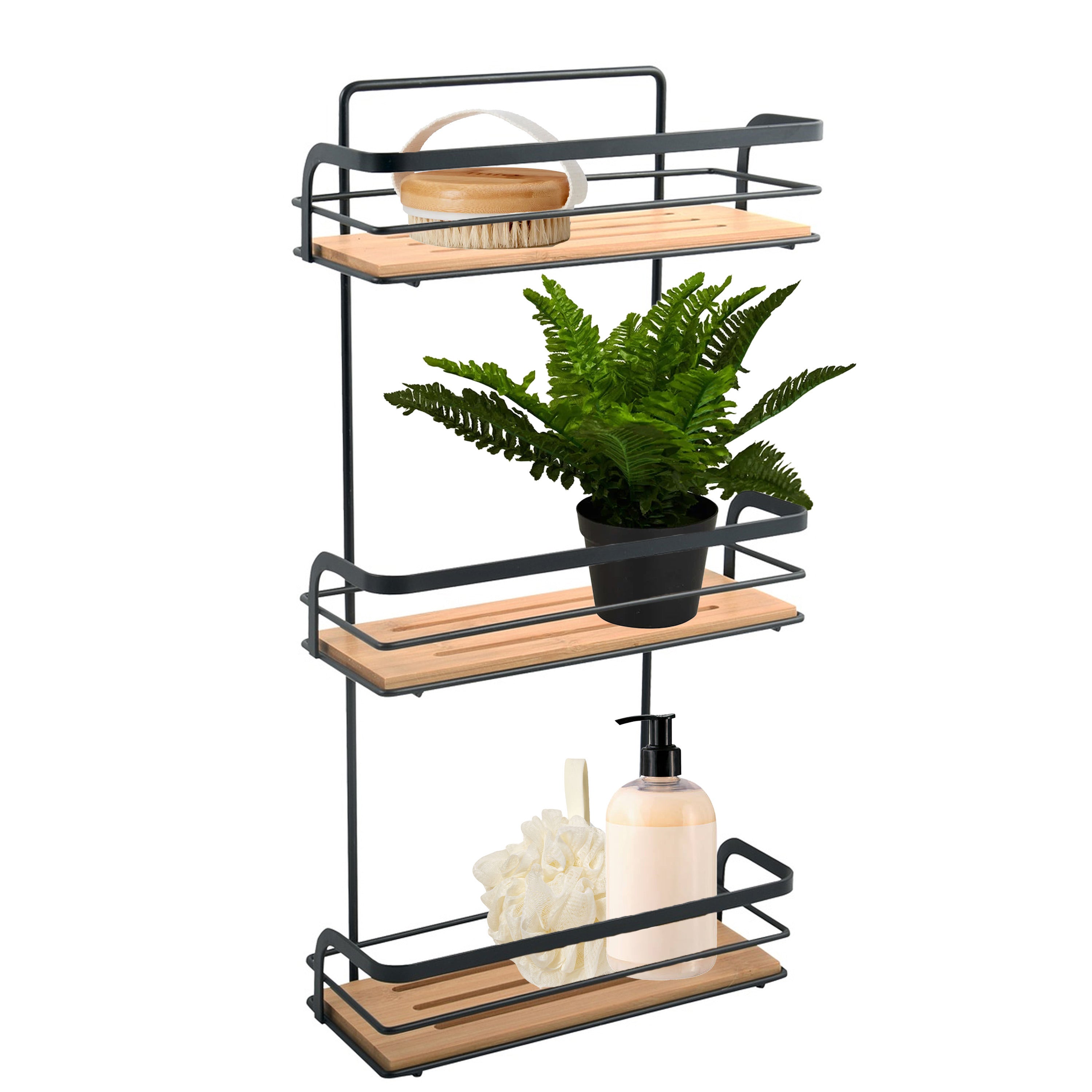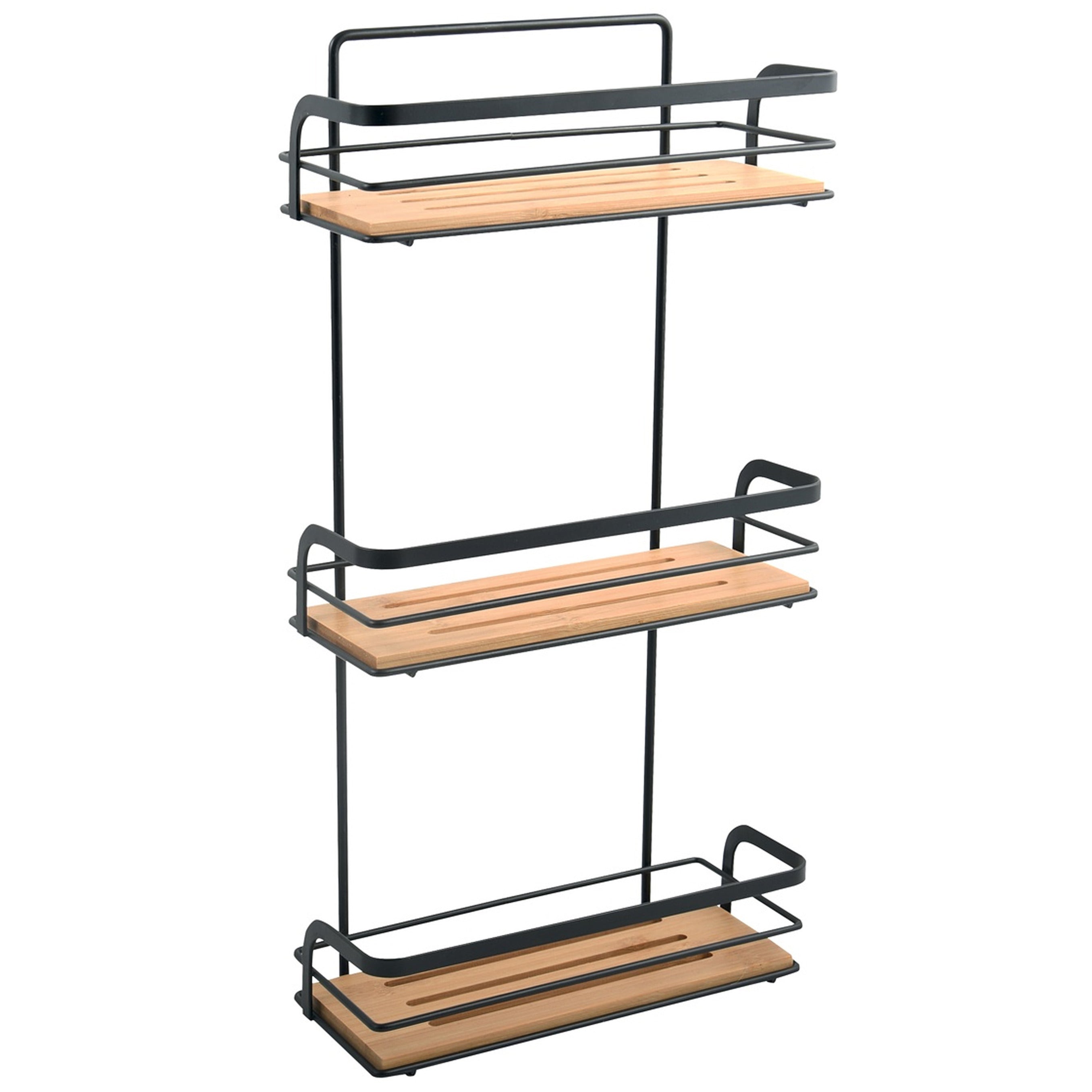 MSV 3-laags doucherekje/badkamerrekje gemaakt van metaal en bamboe in de kleur zwart. Handig rekje voor in de badkamer om o.a. zeep en shampoo flessen in te plaatsen. Bevestig het mandje eenvoudig aan de wand door middel van de meegeleverde zuignappen of schroeven. Materiaal: metaal/bamboe. Formaat: ca. 25,5 x 10,5 x 49 cm.