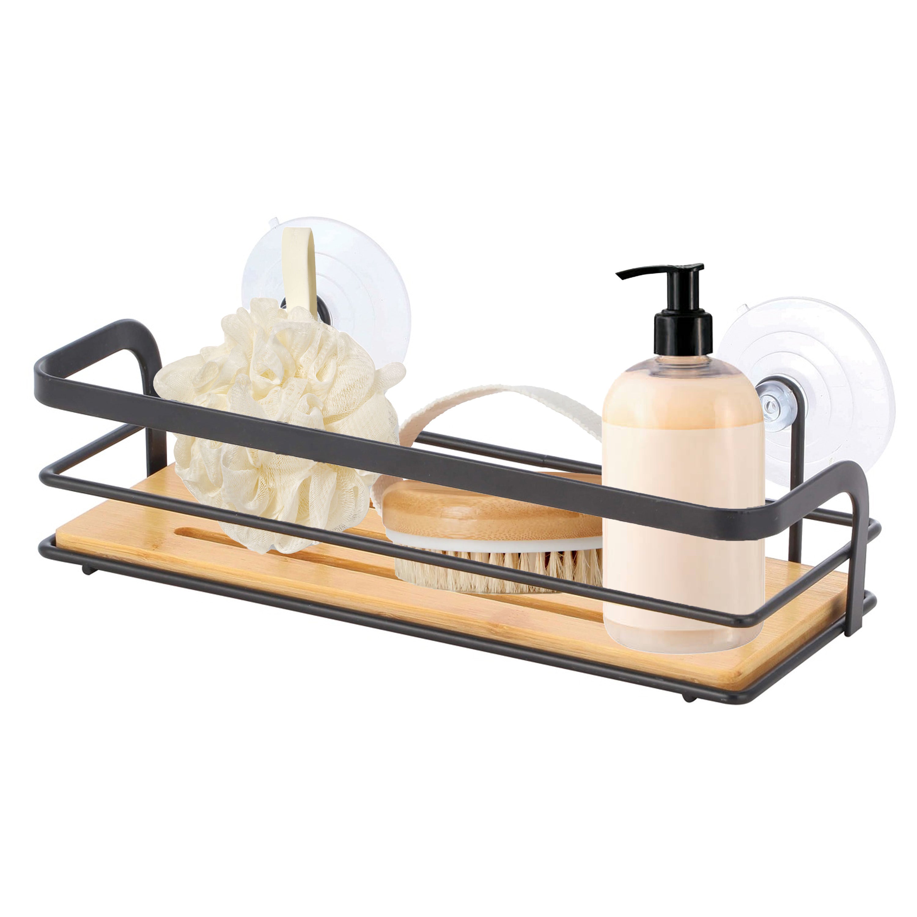 MSV luxe doucherekje/badkamerrekje gemaakt van metaal en bamboe in de kleur zwart. Handig rekje voor in de badkamer om o.a. zeep en shampoo flessen in te plaatsen. Bevestig het mandje eenvoudig aan de wand door middel van de meegeleverde zuignappen. Materiaal: metaal/bamboe. Formaat: ca. 25,5 x 12 x 9 cm.