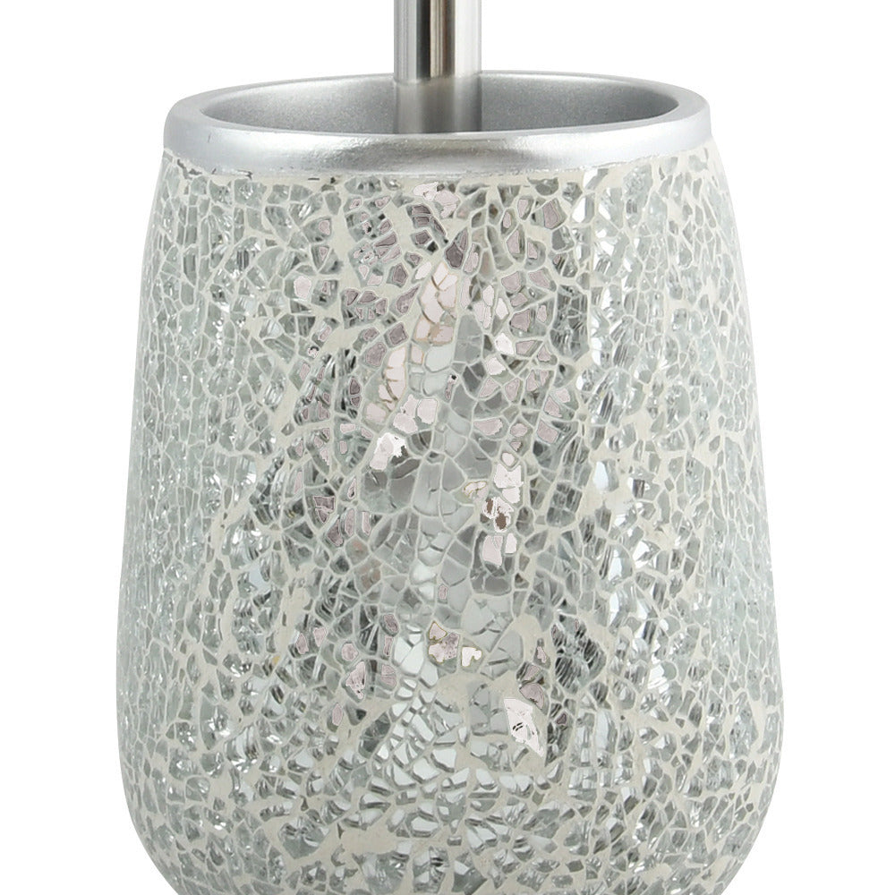 Toiletborstel in houder/WC-borstel in de kleur zilver mozaiek/glitter, gemaakt van polyresin kunststeen en een rvs steel. De stijlvolle borstelhouder heeft een luxe mooie art-deco print. De totale hoogte inclusief rvs steel is 36 cm. Luxe badkamer en wc/toilet accessoires voor uw huis. Serienaam: Scarlett.