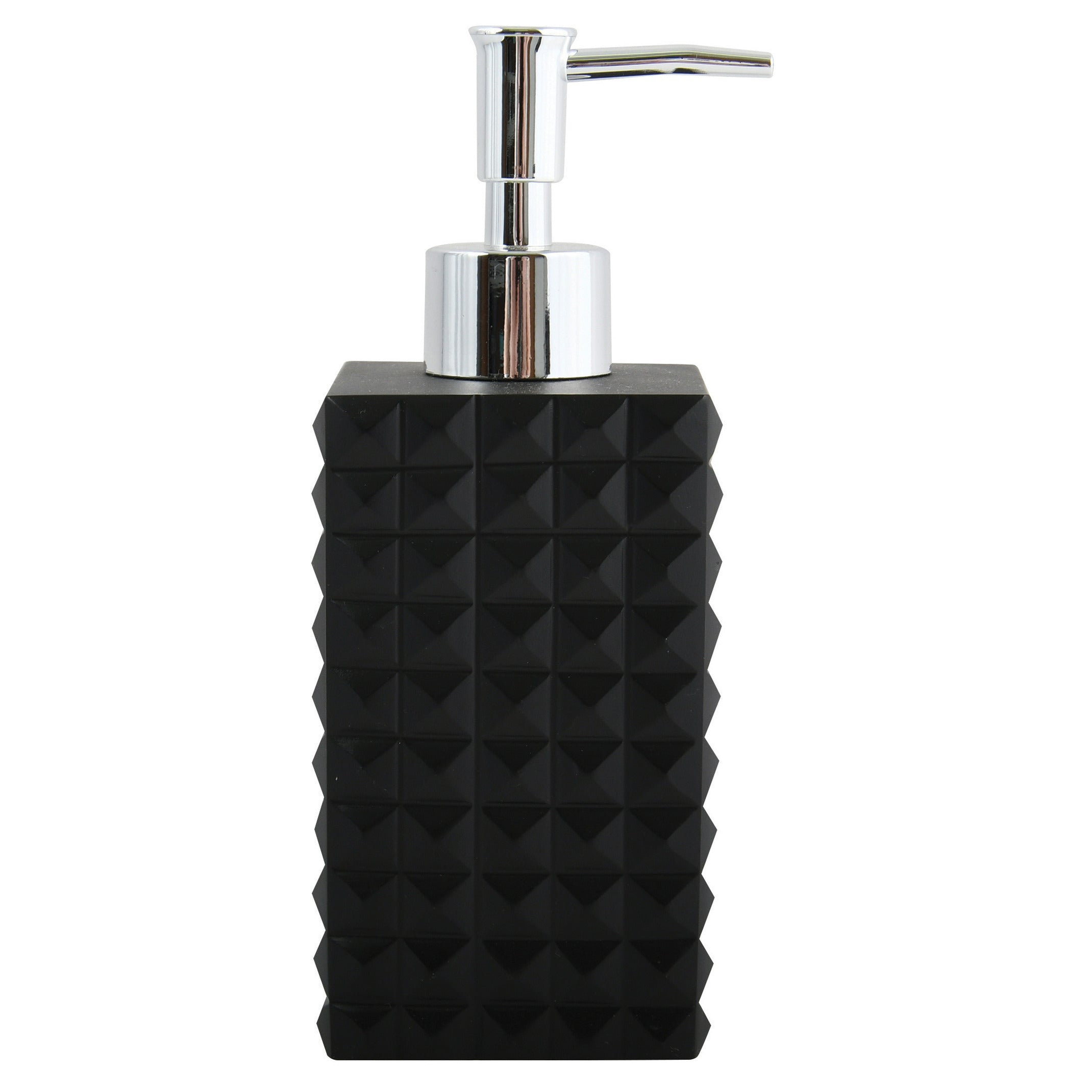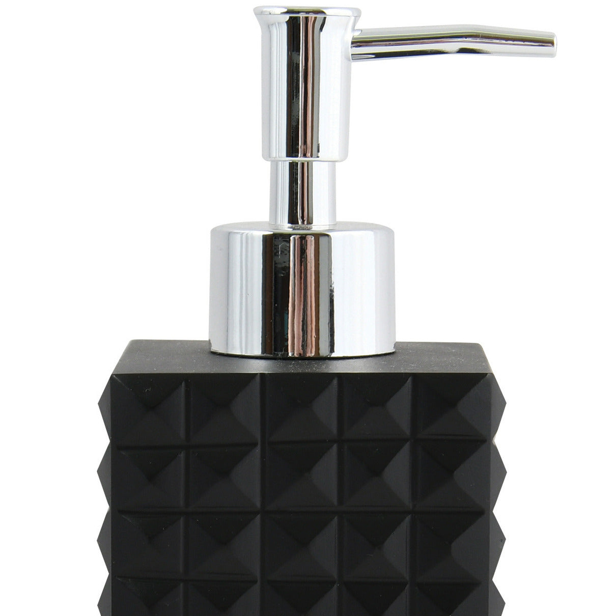 Zeeppompje/zeepdispenser, gemaakt van polyresin/kunststeen in de kleur zwart met kubus/piramides deco print en rvs pompje. De vloeibaar zeep dispenser heeft een stijlvol en compact ontwerp. Ideaal voor in de badkamer of het toilet. Afmetingen: ca. 7 x 17 cm. Inhoud: ca. 270 ml. Serienaam: Kubik.