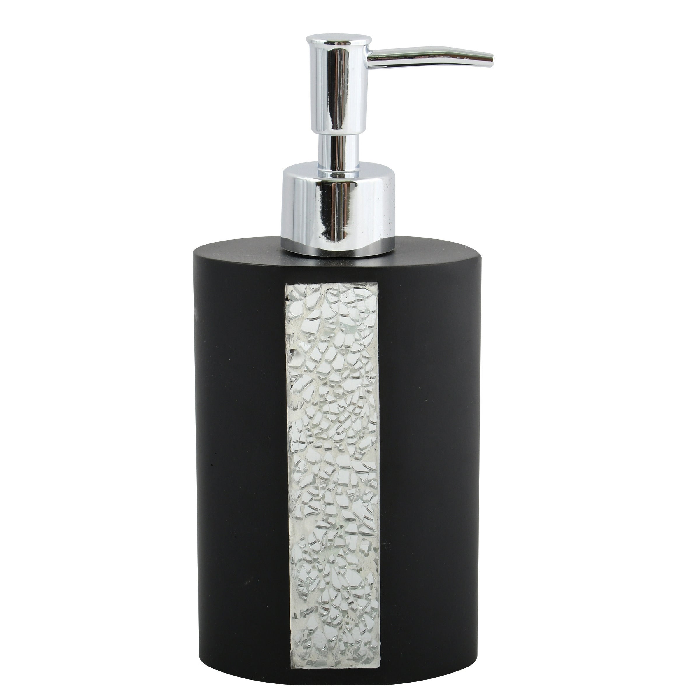 Zeeppompje/zeepdispenser, gemaakt van polyresin/kunststeen in de kleur zwart/zilver glitters en rvs pompje. De vloeibaar zeep dispenser heeft een zeer stijlvol en compact ontwerp. Ideaal voor in de badkamer of het toilet. Afmetingen: ca. 8 x 18 cm. Inhoud: ca. 250 ml. Serienaam: Luanda.