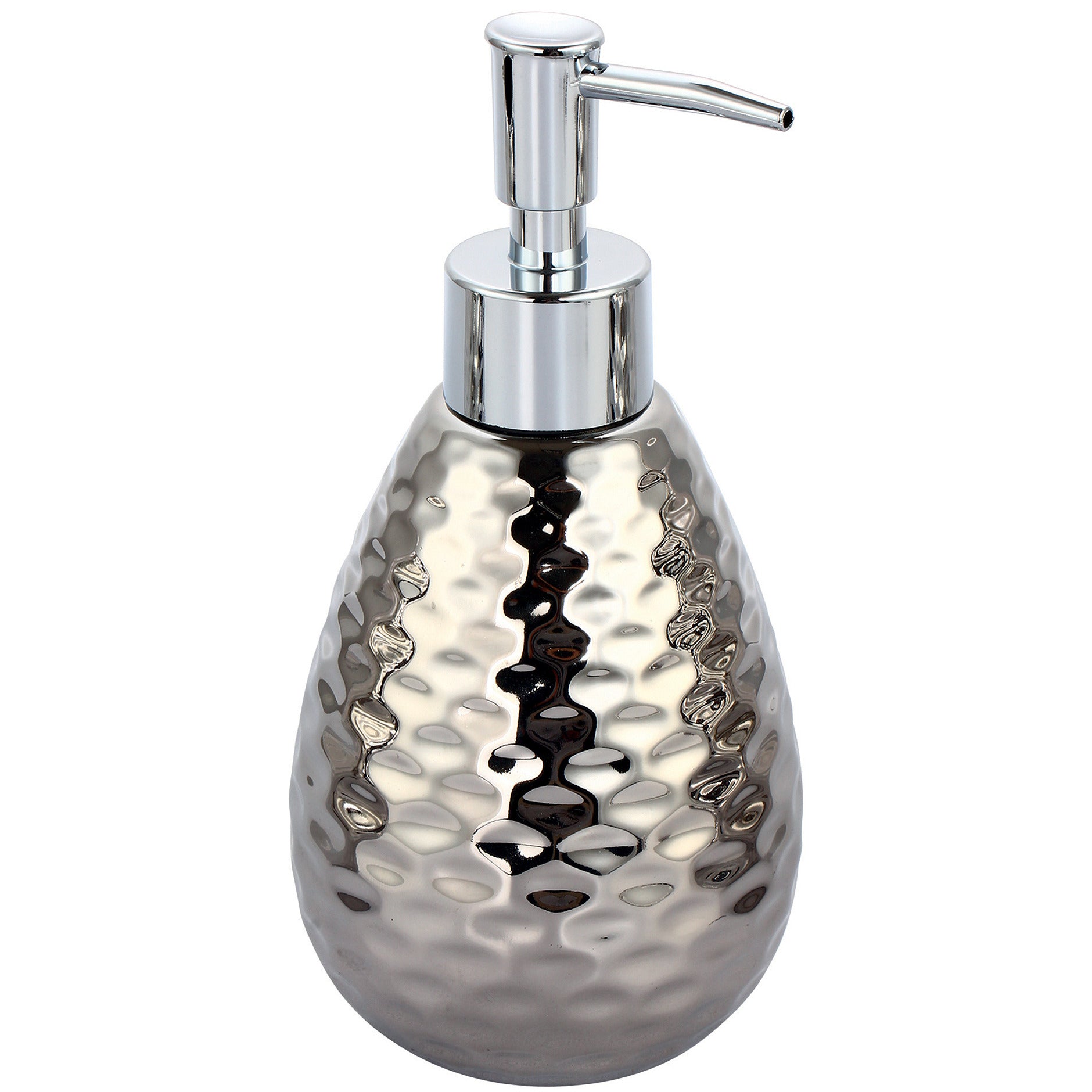 Zeeppompje/zeepdispenser, gemaakt van keramiek in de kleur zilver kleur met glanzende gehamerd motief finish en rvs pompje. De vloeibaar zeep dispenser heeft een luxe, stijlvol en compact ontwerp. Ideaal voor in de badkamer of het toilet. Afmetingen: ca. 8 x 17 cm. Inhoud: ca. 260 ml. Serienaam: Phoenix.