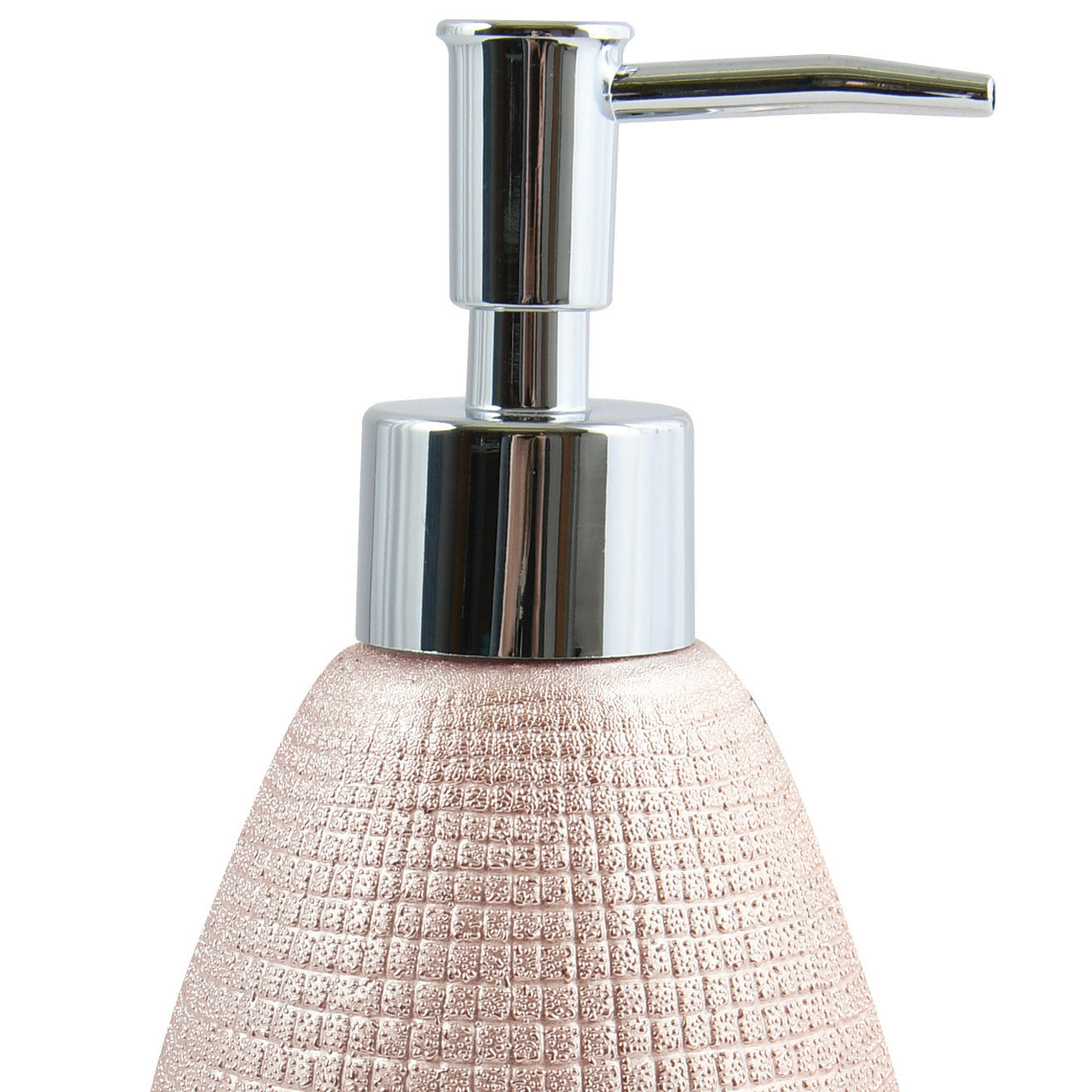 Zeeppompje/zeepdispenser, gemaakt van keramiek in de kleur rose goud met deco finish relief en rvs pompje. De vloeibaar zeep dispenser heeft een luxe, stijlvol en compact ontwerp. Ideaal voor in de badkamer of het toilet. Afmetingen: ca. 8 x 17 cm. Inhoud: ca. 260 ml. Serienaam: Shanghai.