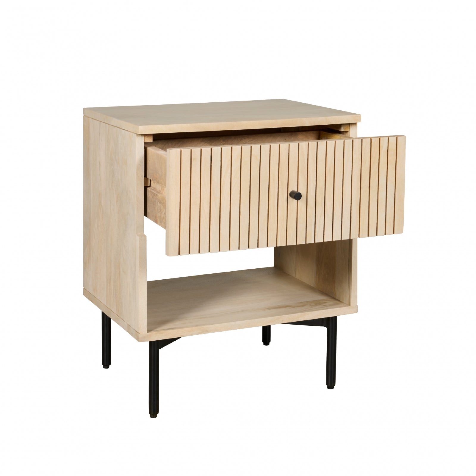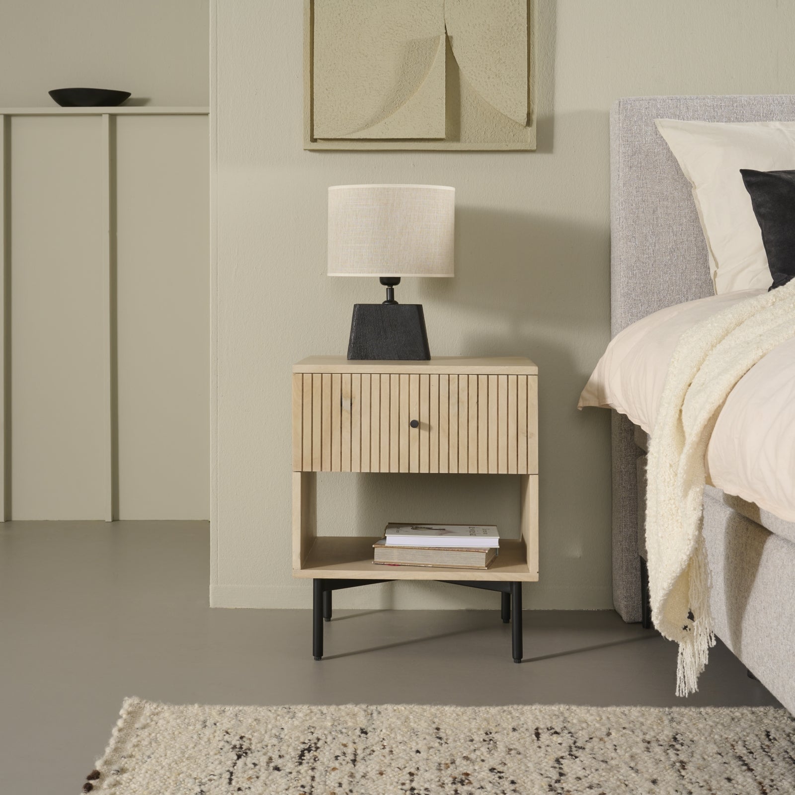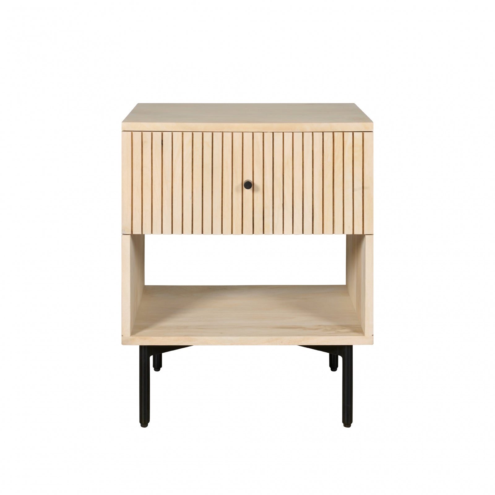 Dit kubistische nachtkastje met lade is vervaardigd uit hout met verticale lijnen. Het opvallende detail van dit meubelstuk is het gekruiste zwarte onderstel. Het is een modern en speels ontwerp dat perfect past in een eigentijdse slaapkamer. Het nachtkastje, genaamd Arabi, is gemaakt van mangohout met een lichte naturel finish. De fraaie lijnen op de lade geven het kastje een unieke uitstraling.- afmeting 45x55x35 cm (bxhxd)