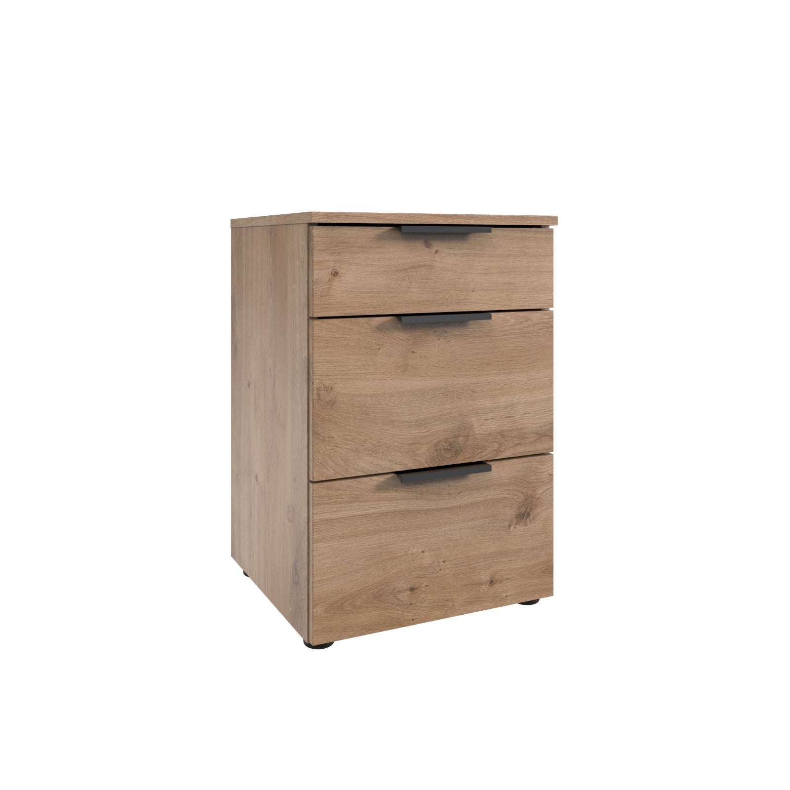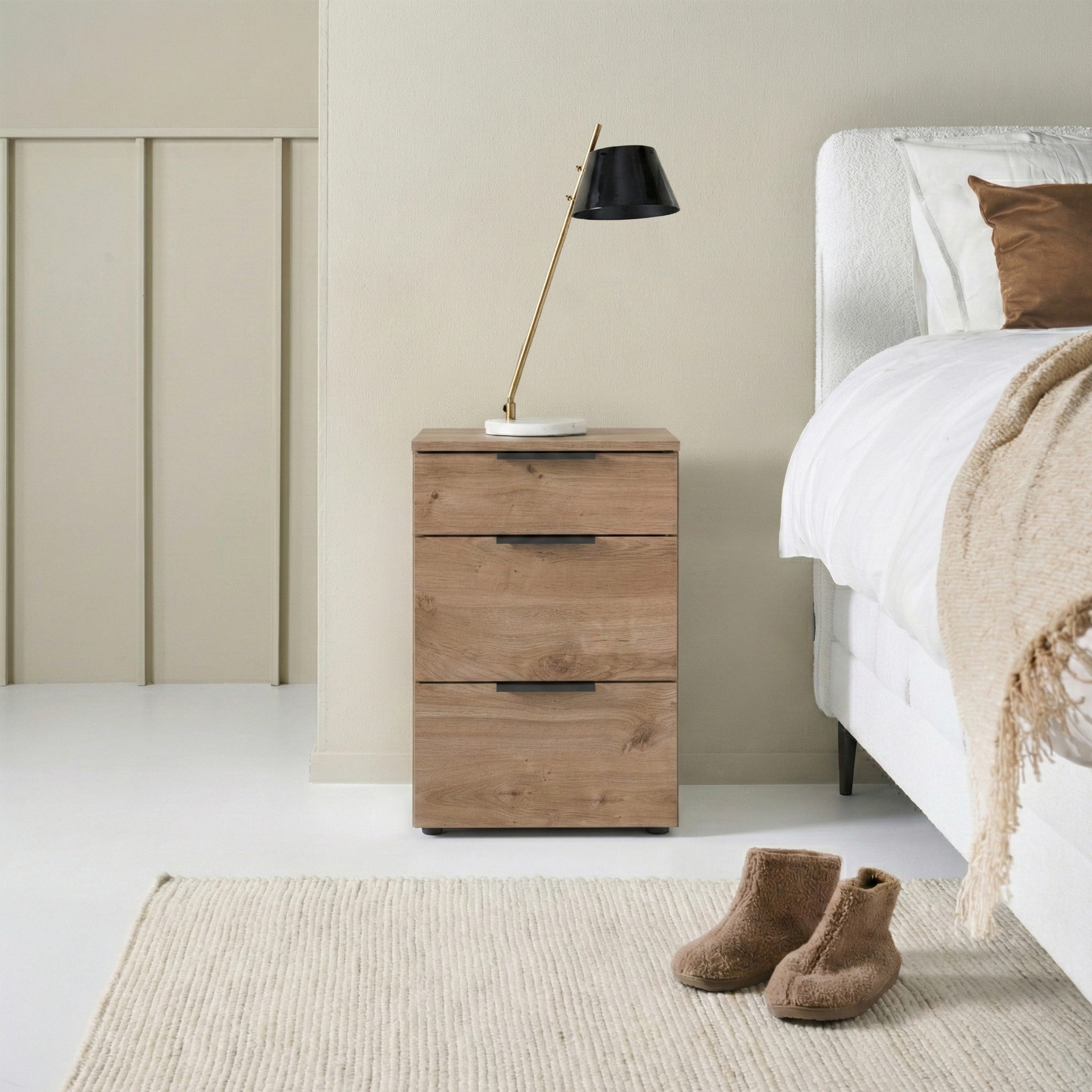 Nachtkastje Elda is perfect geschikt voor naast je bed. Het biedt niet alleen handige opberglades, maar ziet er ook nog eens stijlvol uit. Het strakke design met eikenhoutlook en robuuste handgrepen van zwart metaal maken dit nachtkastje een echte eyecatcher in elke slaapkamer. Indeling: Het nachtkastje heeft 3 handige lades, waarin je al je spullen netjes kunt opbergen. De bovenste lade is iets minder diep dan de onderste, waardoor het perfect is voor het bewaren van items zoals je telefoon, opladers en bril - alles wat je 's nachts binnen handbereik wilt hebben. Met nachtkastje Elda blijft je slaapkamer georganiseerd en opgeruimd. Belangrijk om te weten: Nachtkastje Elda is 41 cm breed, 41 cm diep en 61 cm hoog. Het is gemaakt van plaatmateriaal met een folie afwerking in naturel eikenhout decor. De 3 lades hebben zwart metalen handgrepen. Het ladekastje moet nog gemonteerd worden.| Afmetingen | |