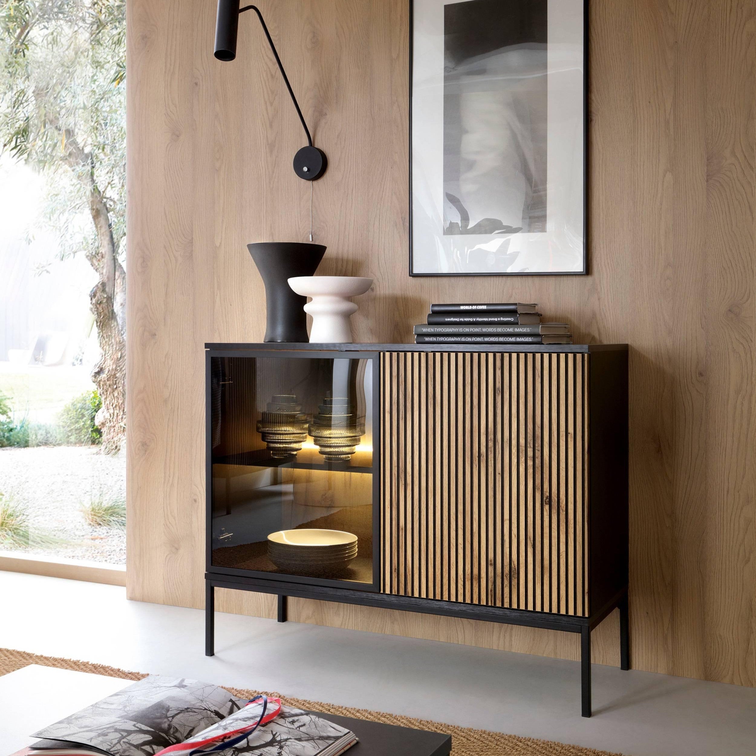 - De glazen deur geeft een mooi doorkijkje naar de planken die aan de achterkant op subtiele wijze verlicht zijn met warm wit licht