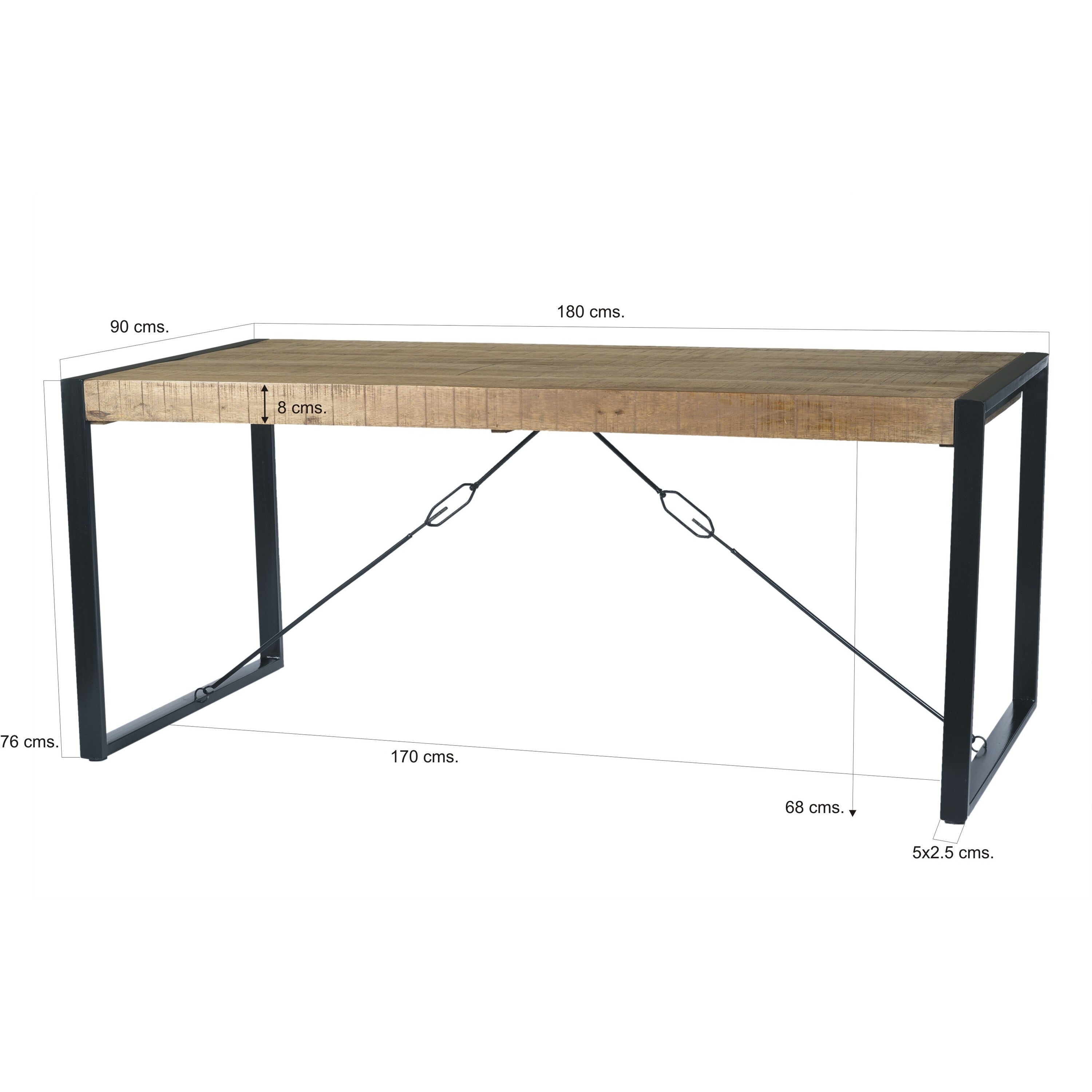 Hoogte in cm: 76 Lengte in cm: 180 Breedte in cm: 90 Materiaal: Mangohout / Gecoat Staal Vorm: Rechthoek Collectie: Nairobi Type blad: Opgedikt Dikte tafelblad: 8 Afwerking: Gelakt Onderhoud: Zachte vochtige doek
