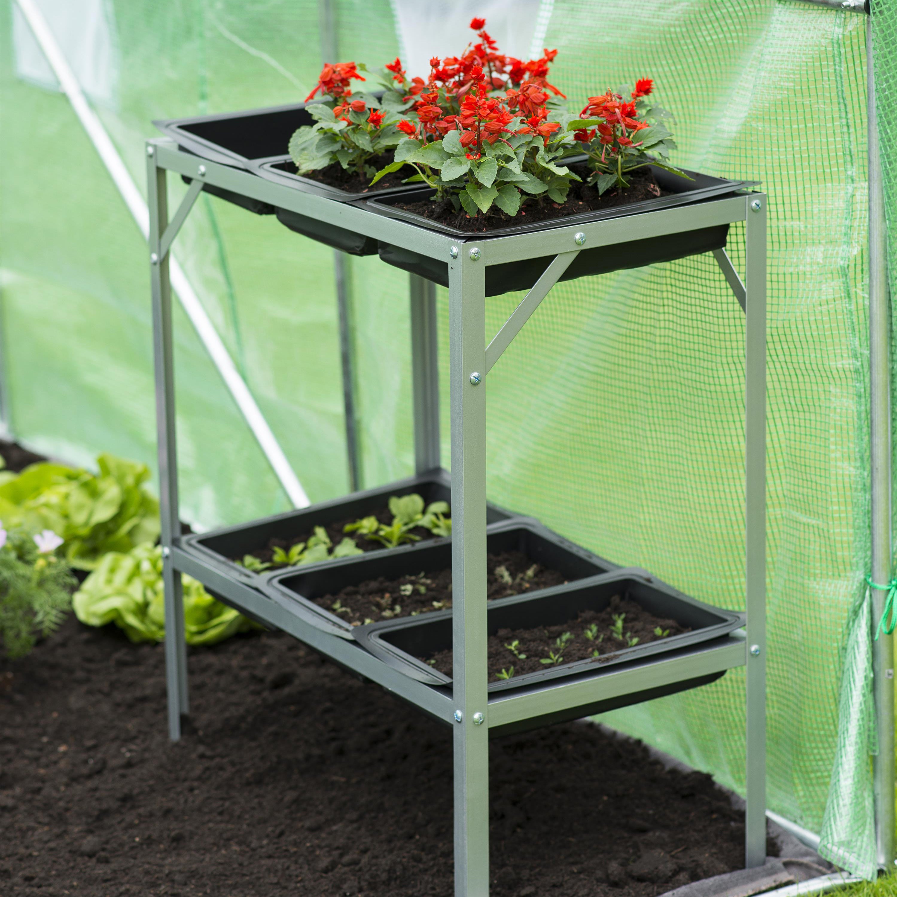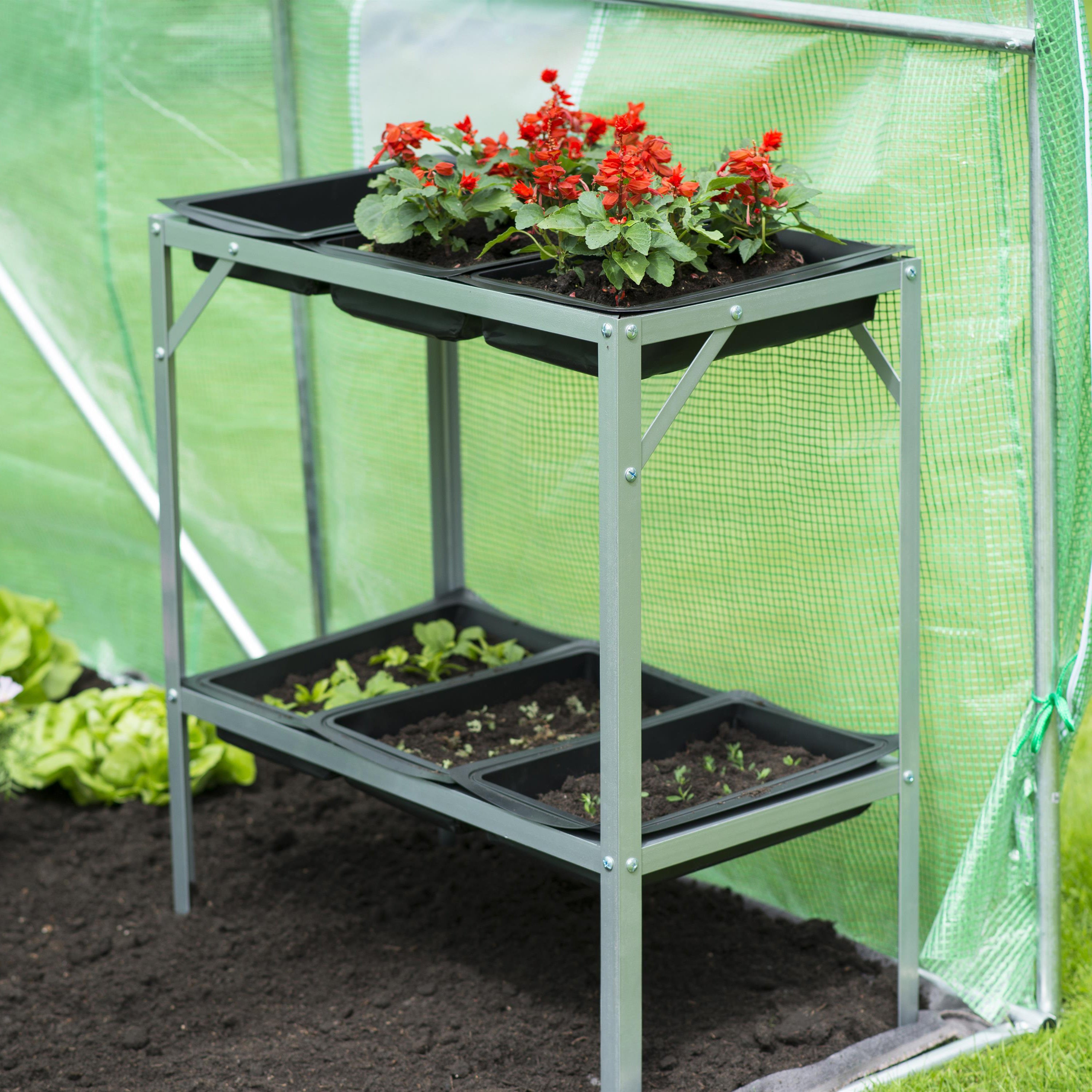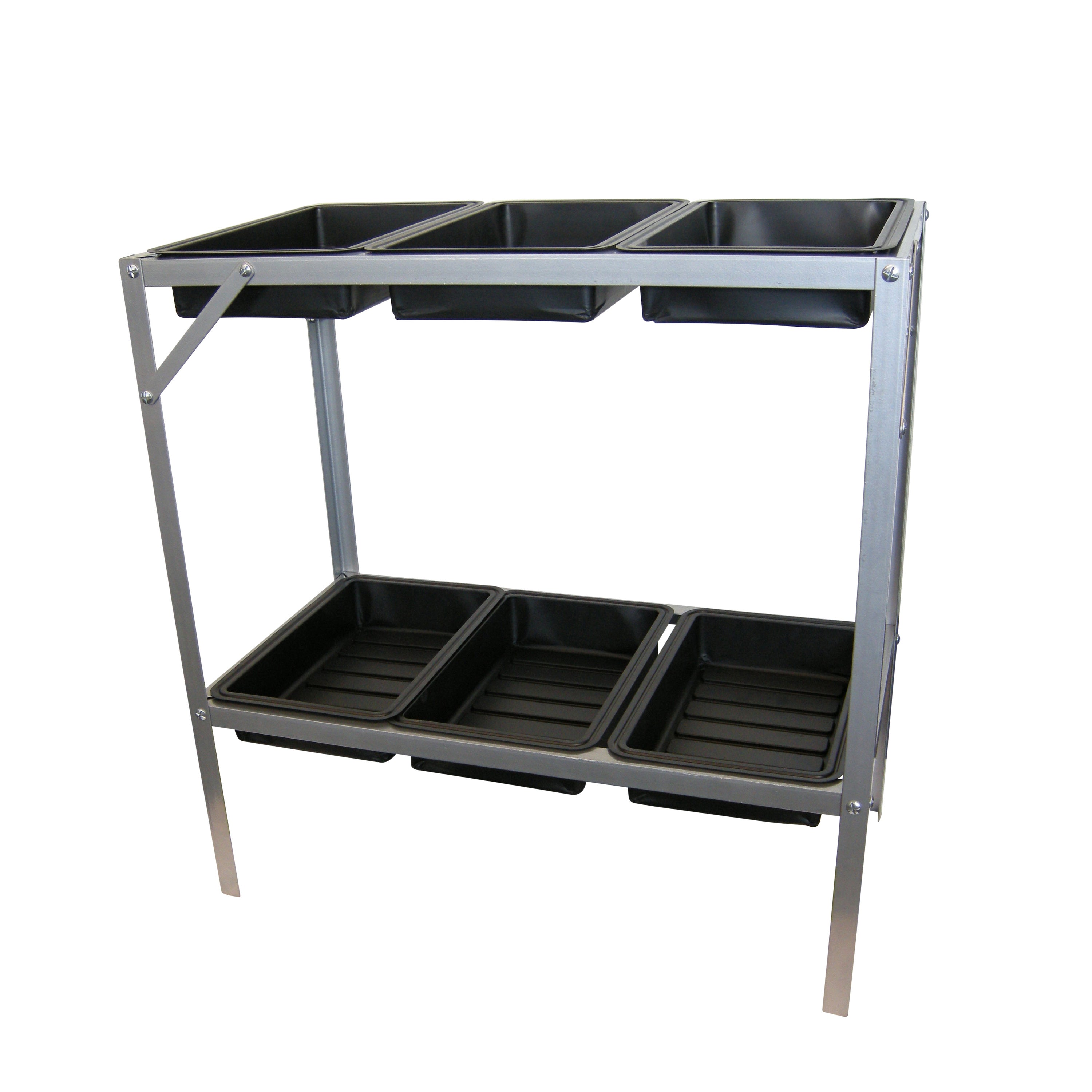 De tafel is gemaakt van stevig, verzinkt staal. De zes zwarte bakken zijn van kunststof.