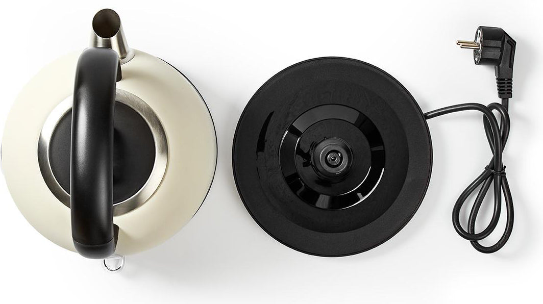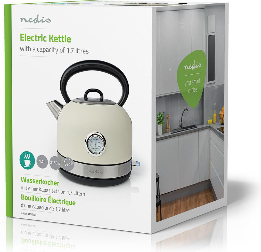 Onze stijlvolle, krachtige Nedis waterkoker werkt net zo goed als hij eruit ziet: hij heeft een zeer ruime inhoud van 1,7 liter. Dankzij een krachtig vermogen van 2150 watt heb je je kopje thee zo gezet. Het klassieke design en de analoge thermometer geven deze waterkoker een retro uitstraling en door de matte afwerking is hij een elegante toevoeging voor iedere keuken. De waterkoker zelf is draadloos en is 360° draaibaar op de voet, waardoor je de waterkoker eenvoudig optilt. Het verwarmingselement is afgeschermd van het water, waardoor de kalkaanslag minimaal is; samen met het uitneembare filter is de waterkoker daarom eenvoudig schoon te maken. Hierdoor hebben al je warme dranken een heerlijke, constante smaak.
