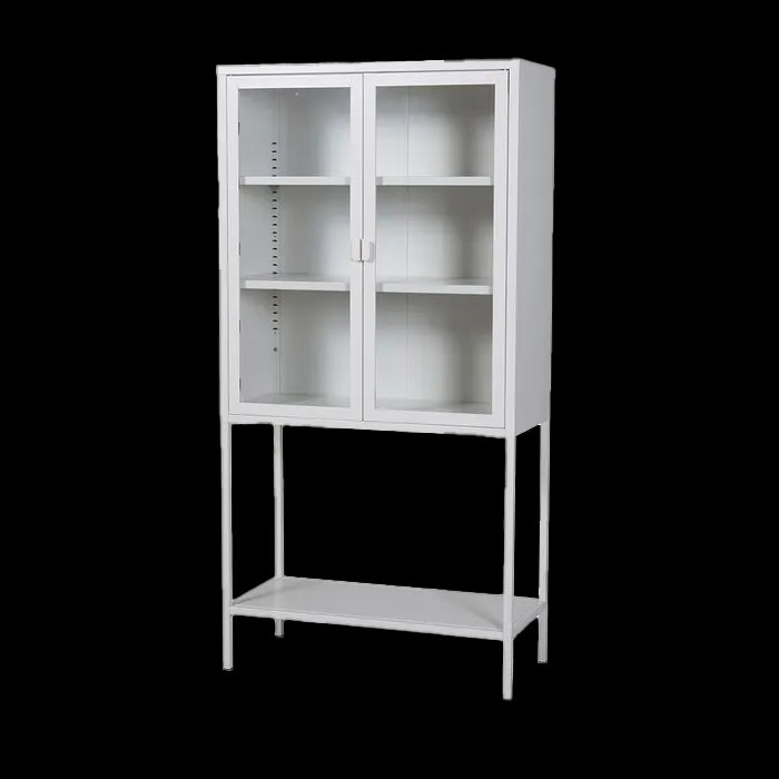 De Claes kast van het merk Nest living is een strakke en moderne vitrinekast met deurtjes van glas. De vitrinekast is gemaakt van gepoedercoat staal en is in wit en zwart verkrijgbaar. De kast staat op een hoog frame en heeft twee glazen deuren. Achter de deurtjes zitten drie planken om spullen op te leggen. Ook tussen de poten zit nog een plank die je kan gebruiken om spullen op te leggen. Deze glazen vitrinekast leent zich perfect voor het uitstallen van souvenirs, snuisterijen en andere leuke accessoires. Door de hoogte van 150 centimeter kan je ook de bovenkant van de kast nog gebruiken om bijvoorbeeld een plant of poster op te zetten.