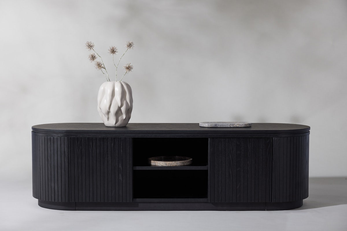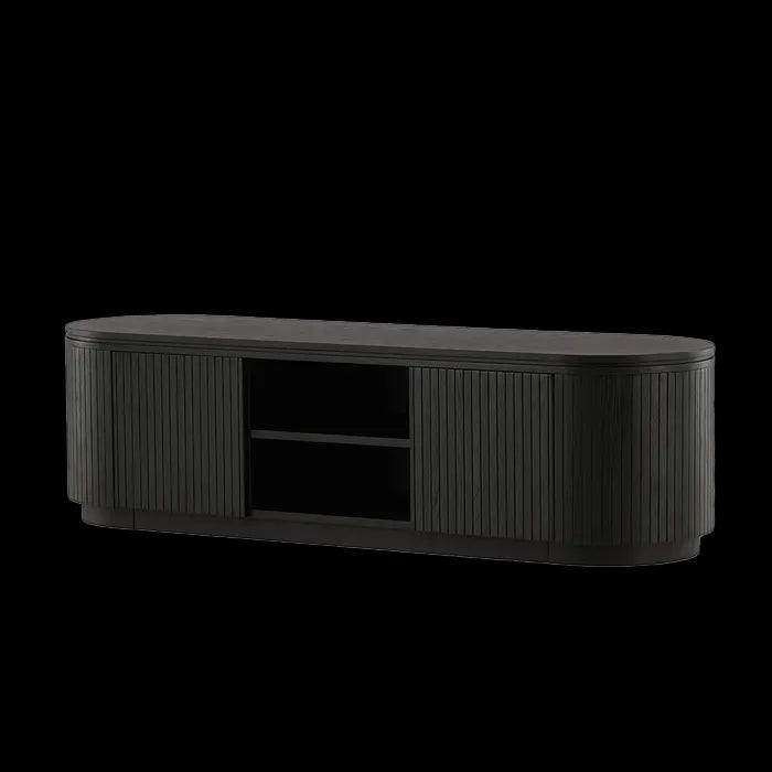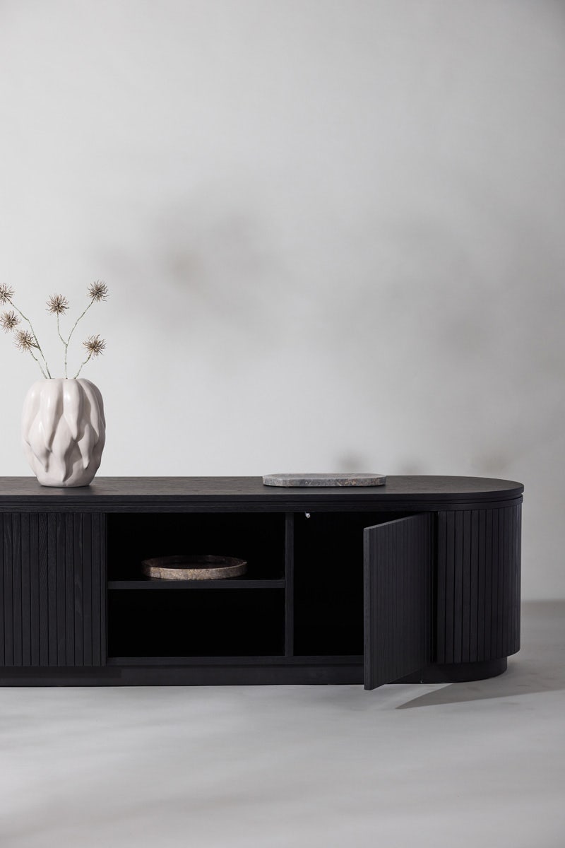 De tv-kast is gemaakt van hout met eikenfineer en is rondom afgewerkt met verticale latjes, wat het geheel een trendy uitstraling geeft. Het tv-meubel is ontworpen met twee deurtjes en twee open vakken in het midden. Achter de deurtjes zit voldoende ruimte om alle tv-toebehoren op te bergen en de open vakken kan je gebruiken voor mooie accessoires of boeken. Door de ovale vorm valt Devin extra op in huis en is het een echte blikvanger in de zithoek. Het Devin tv-meubel is natuurlijk ook als lage kast in de hal of woonkamer te gebruiken.