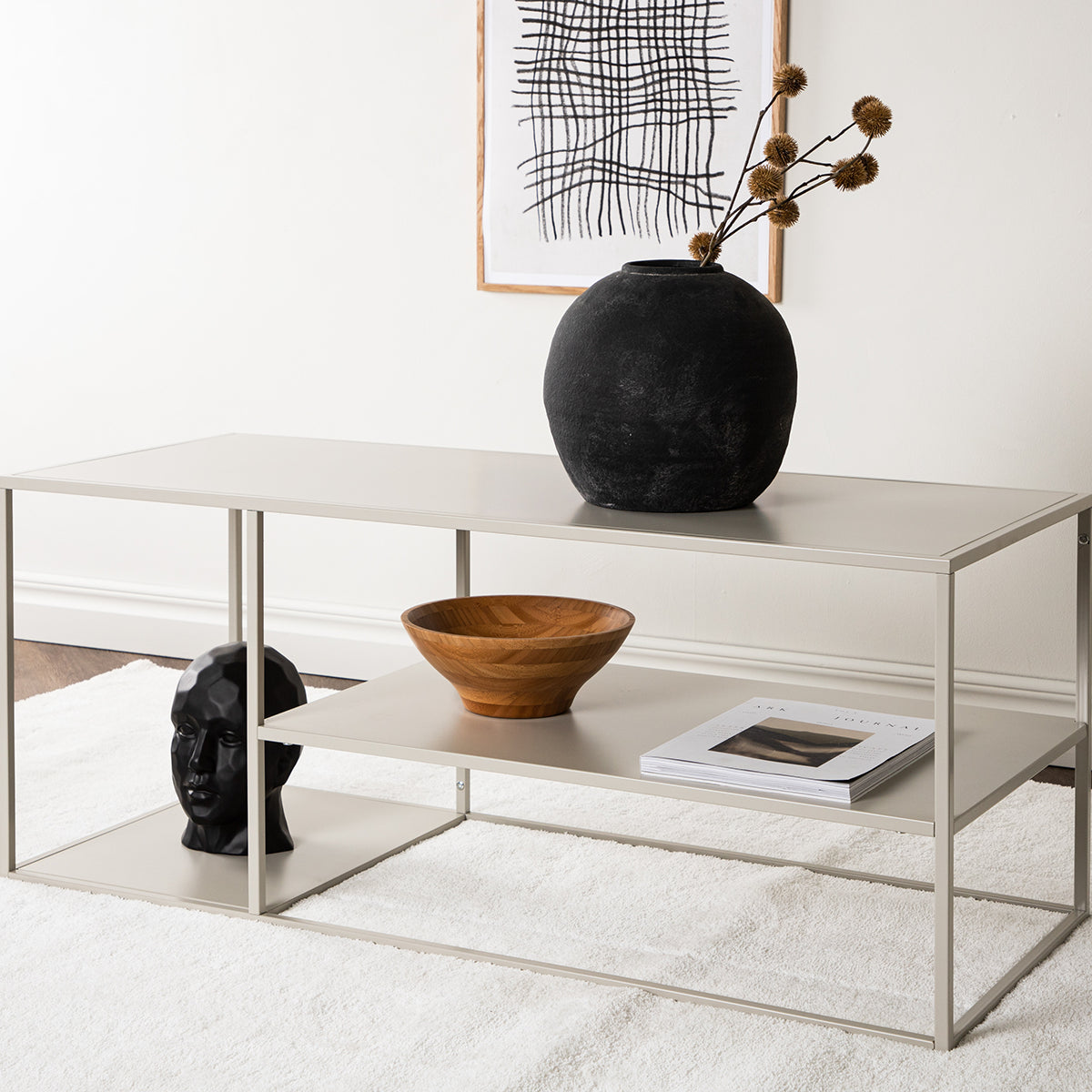 Deze rechthoekige salontafel heeft een minimalistisch design dat moeiteloos past in een modern of industrieel interieur. Daarnaast is deze tafel gemaakt van hoogwaardig metaal, waardoor hij duurzaam en stabiel is. Dankzij de neutrale kleur past deze beige salontafel bij diverse kleurenpaletten. De tafel heeft een royale afmeting van 120 x 55 cm en biedt onder het tafelblad extra opbergruimte voor bijvoorbeeld tijdschriften of een leuke plaid. Dankzij het veelzijdige ontwerp is de Jesse salontafel niet alleen perfect voor de woonkamer, maar ook geschikt voor andere ruimtes zoals een kantoor of wachtkamer. Als tv-meubel is deze moderne salontafel ook absoluut geschikt.