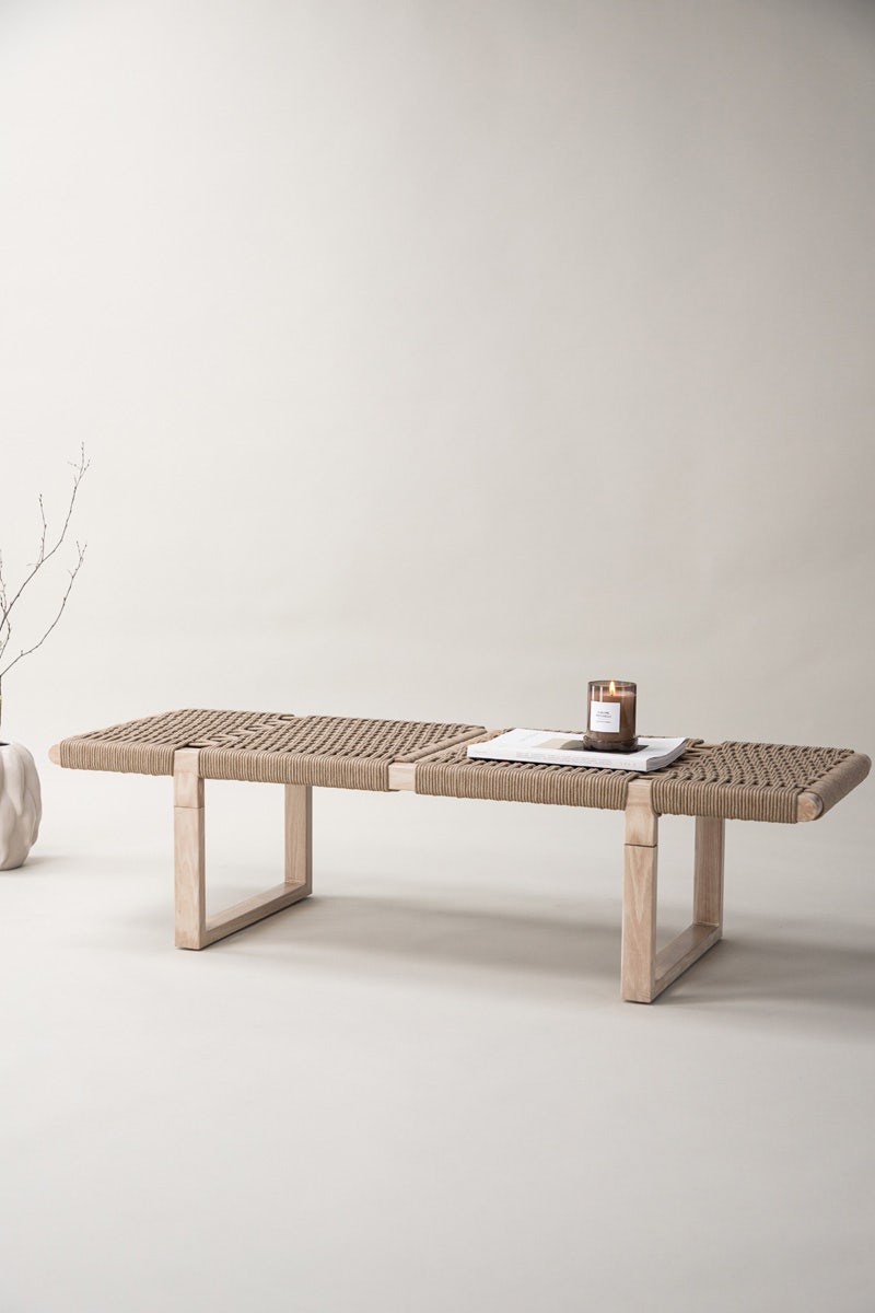 Het onderstel van het bankje is gemaakt van staal en de zitting is gemaakt van duurzaam polyester touw. De combinatie van de materialen met de aardse kleuren zorgt voor een fijne sfeer en Scandinavische uitstraling. Dankzij het praktische formaat kan je dit bankje op verschillende manieren gebruiken in huis. Zet het bankje bijvoorbeeld in de hal voor het aantrekken van je schoenen of gebruik het als decoratie in de woonkamer.