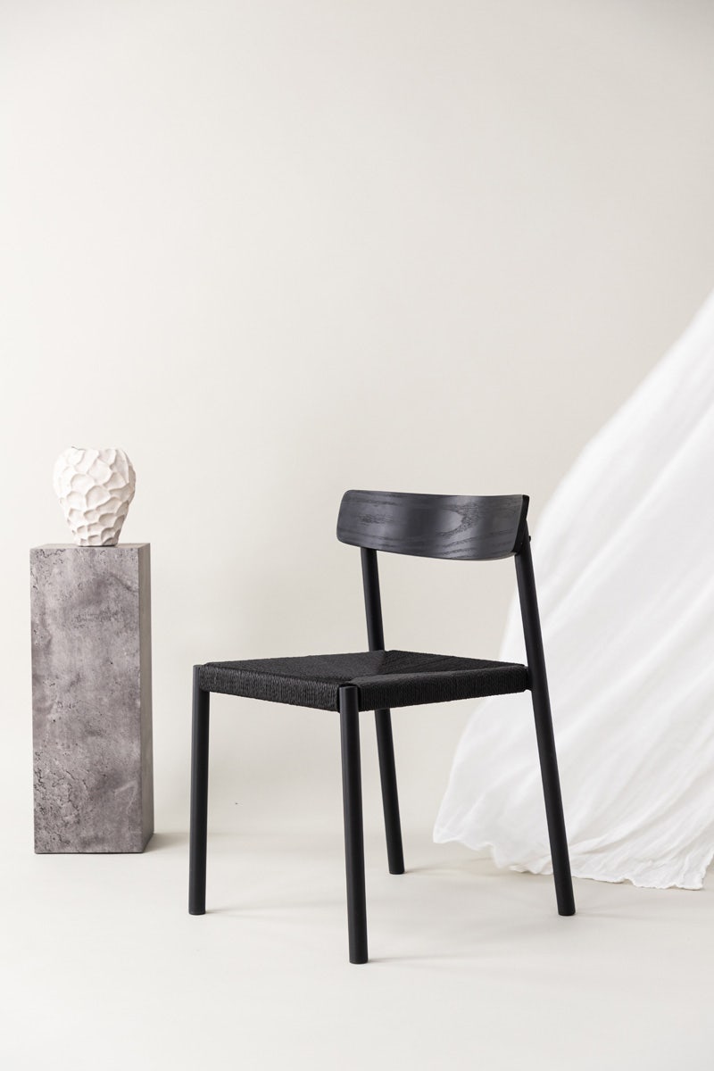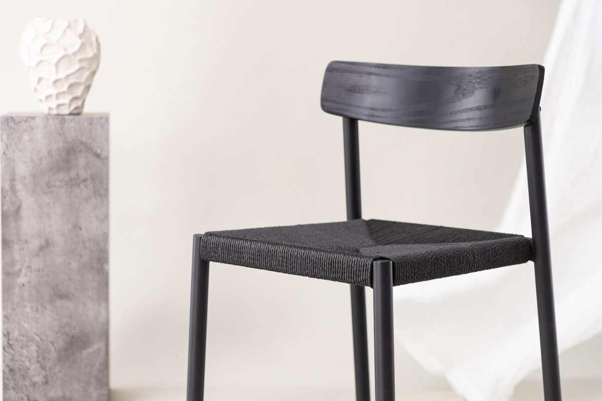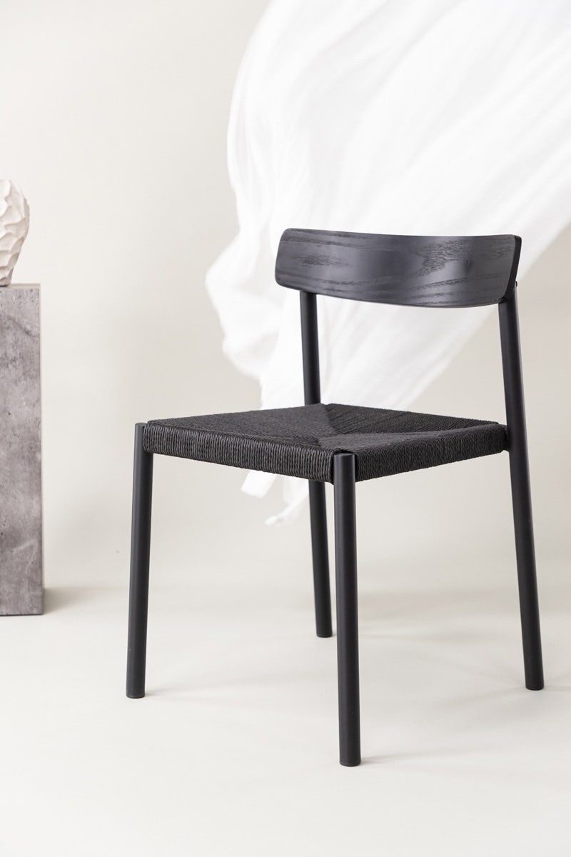 Het frame van deze zwarte eetkamerstoel is gemaakt van metaal. De zitting is gemaakt van duurzaam touw en de rugleuning is gemaakt van hout. Deze combinatie van materialen zorgt voor een spannend geheel dat de aandacht trekt tussen de andere meubels in huis. De Keano eetkamerstoel heeft een Scandinavisch design en geeft een moderne uitstraling aan de eethoek. Combineer de eetkamerstoel met je favoriete tafel en je hebt een perfecte plek voor diners met vrienden of familie.