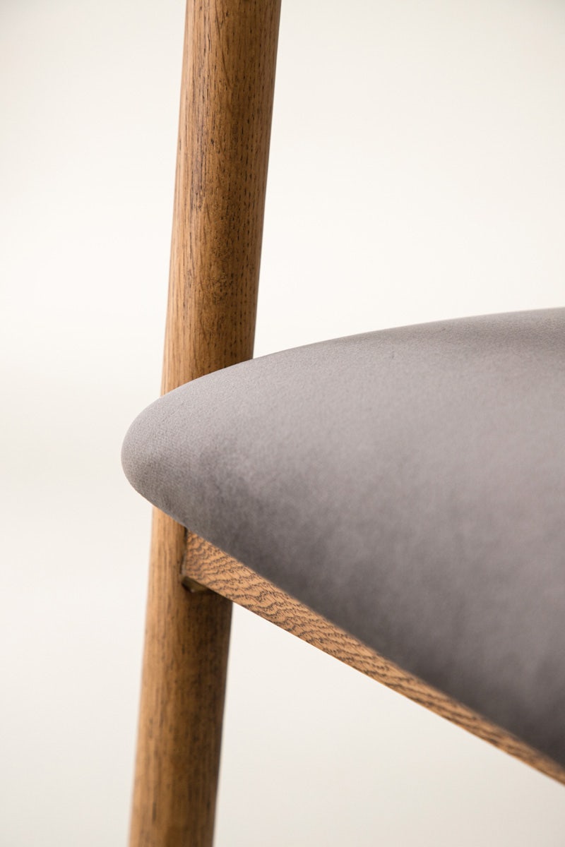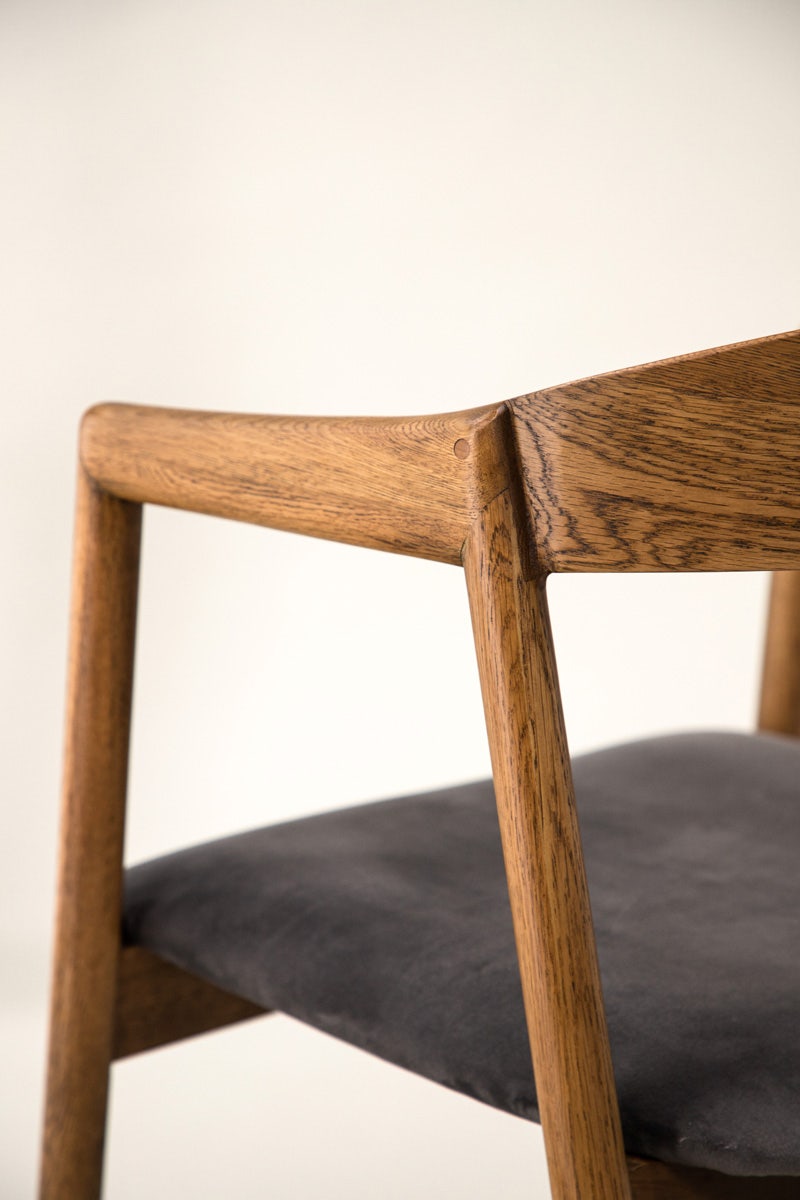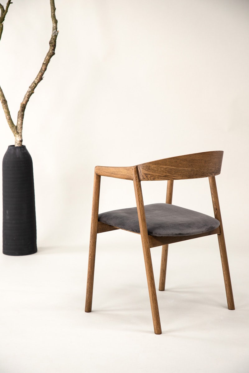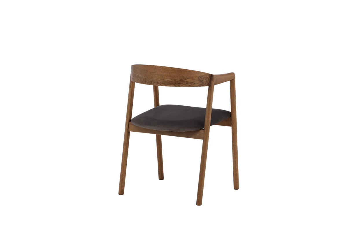 De eetkamerstoel heeft een eikenhouten frame en een zitting van polyester velvet in het grijs. Dankzij de zachte zitting en de armleuningen biedt deze eetkamerstoel veel zitcomfort en kan je langdurig comfortabel aan tafel zitten. De ronde rugleuning volgt de vorm van de rug en zorgt daarnaast voor een prachtig silhouet van de stoel. Combineer de Maja houten eetkamerstoel met een stijlvolle tafel en geniet van gezellige maaltijden in een moderne setting.