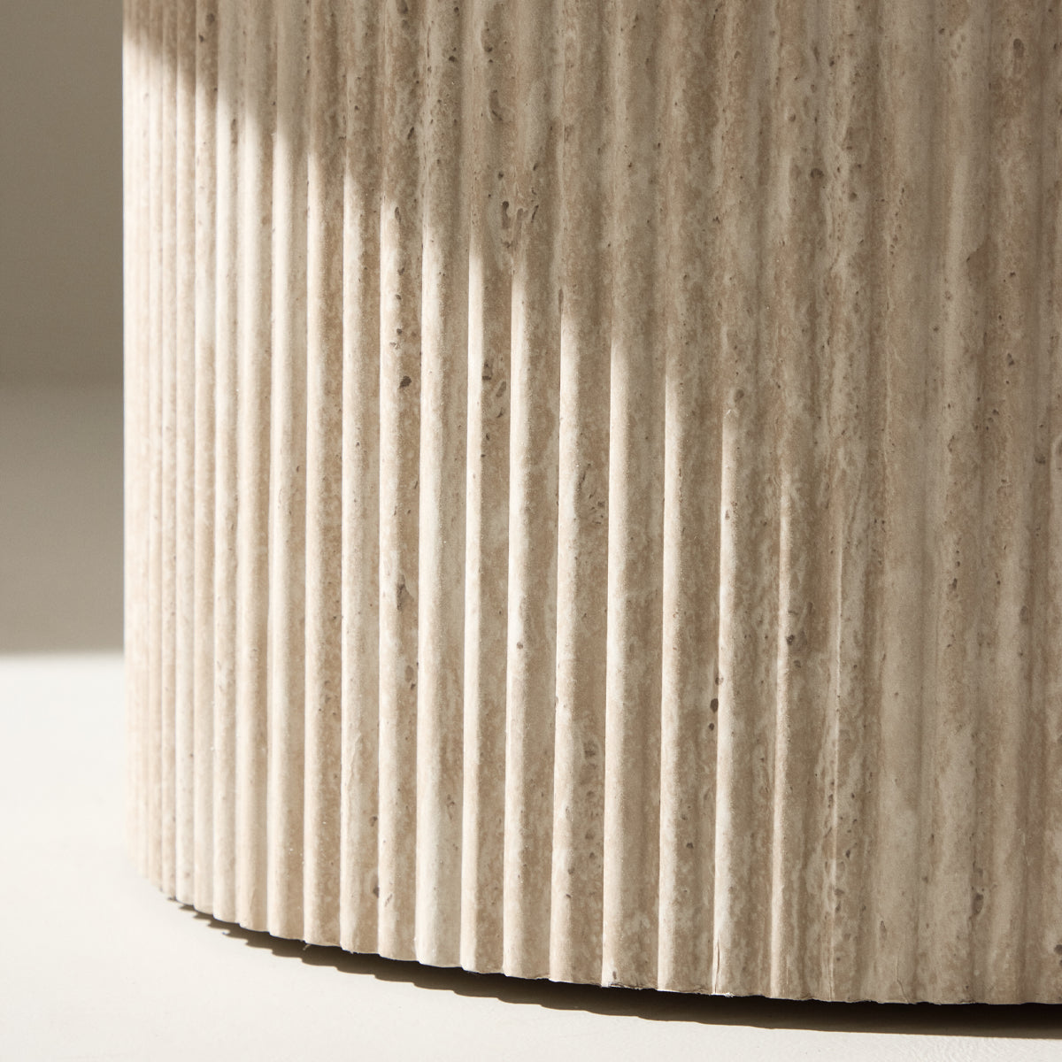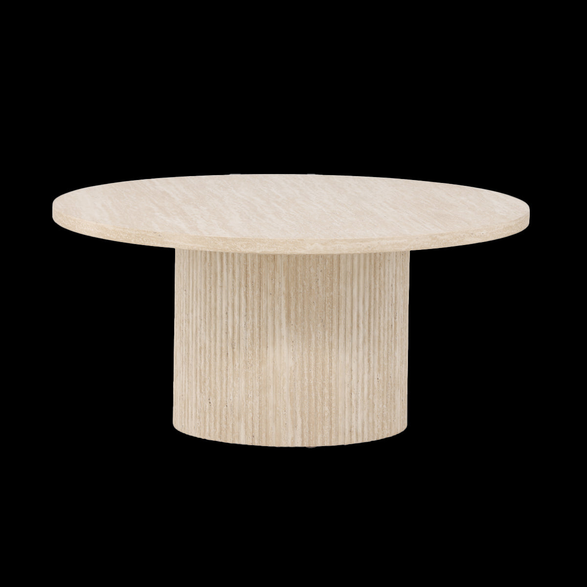 Travertine is een natuurlijk kalkgesteente met een warme, lichtbeige kleur en een herkenbare textuur vol subtiele adertjes en kleine gaatjes. Die natuurlijke tekening zorgt voor een rustige, luxe uitstraling die perfect past bij moderne en Scandinavische interieurs. En het fijne is: dankzij de fineerlaag geniet je van die mooie look, maar blijft de tafel licht, makkelijk in onderhoud én vriendelijk geprijsd. Liever iets kleiners? Nohr is er ook in een 50 cm variant! Of combineer beide maten voor een speels duo met hoogteverschil.