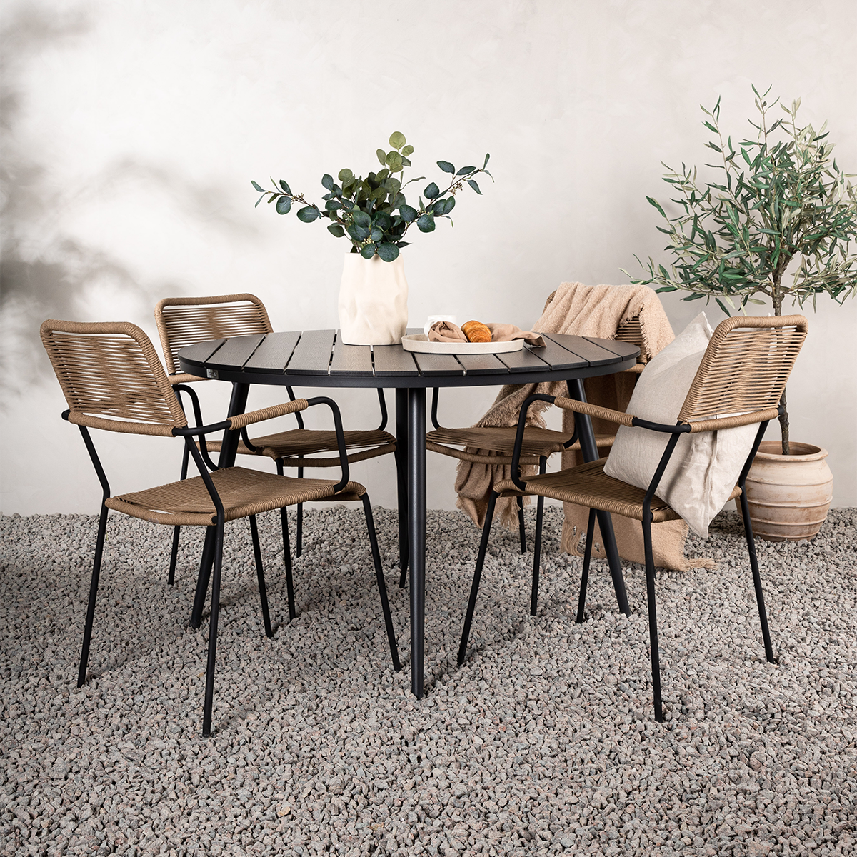 De tuinstoel heeft een frame gemaakt van zwart aluminium met een poedercoating. De zitting en rugleuning zijn gemaakt van polyester touw dat in de breedte van de stoel is gespannen. Ook de armleuningen zijn deels afgewerkt met touw. Met de Jana tuinstoel heb je een stijlvolle tuinstoel die ook nog eens lekker zit. Dit prachtige ontwerp past zowel in een klassieke als een moderne setting. Zet deze tuinstoelen rond de tafel op het terras of in de patio en geniet van gezellige diners in de buitenlucht. Let op: om de tuinstoel te reinigen enkel water en zeep gebruiken. Harde chemicaliën kunnen het touw beschadigen. Ook het gebruik van een hogedrukspuit wordt afgeraden.