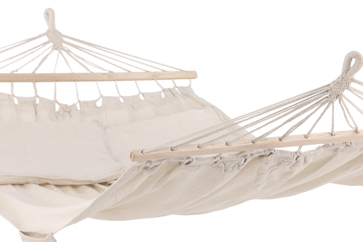 De hangmat is gemaakt van katoen en polyester, en heeft een natuurlijke uitstraling. De houten knijpers aan de uiteinden spannen de stof en zorgen ervoor dat de stof niet samenvouwt. Dankzij het grote formaat is de hangmat geschikt voor twee personen en de bijpassende hoofdkussens zorgen ervoor dat je extra lekker ligt. Hang de Judith hangmat op een mooie plek in de zon of schaduw en geniet van een heerlijk dutje boven de grond.