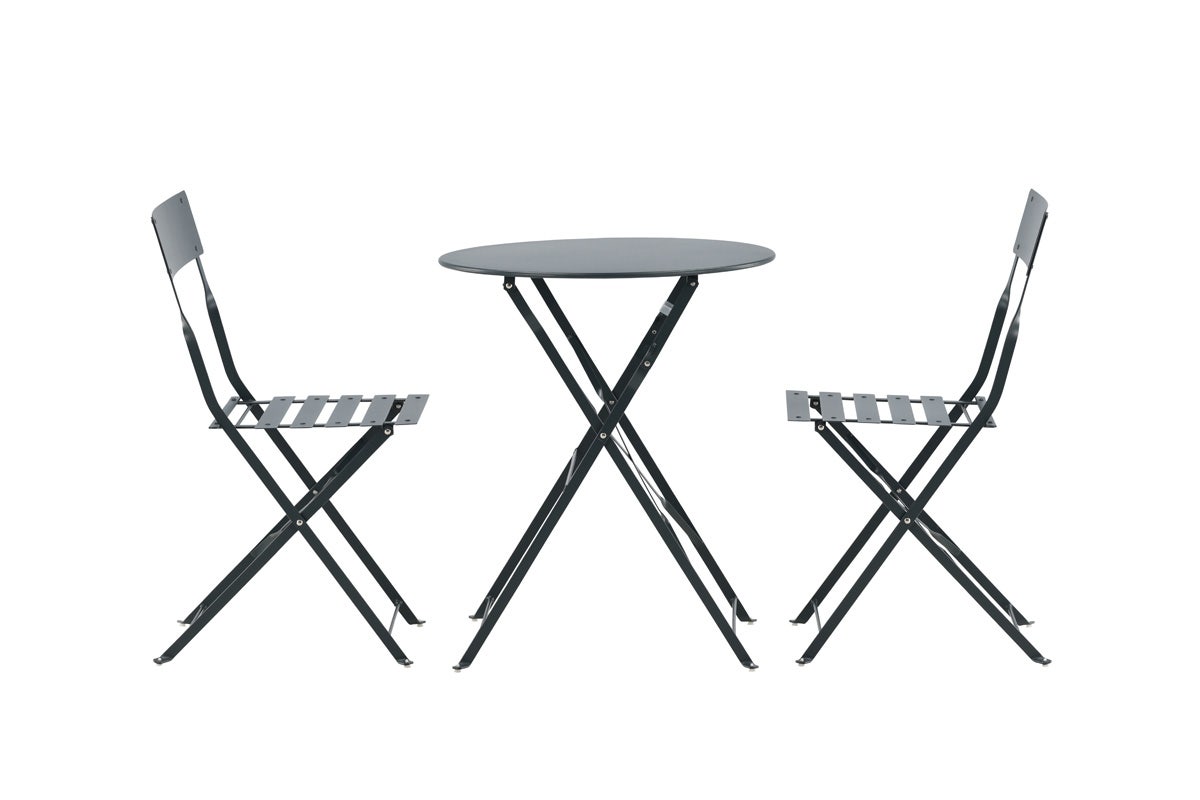 De set bestaat uit twee stoelen en een tafel gemaakt van metaal. Dankzij de donkergrijze kleur heeft de bistroset een chique uitstraling en passen de meubels bij elke stijl in de tuin. Het handige van deze set is dat zowel de stoelen als de tafel opvouwbaar zijn. Zo kan je ze dus netjes opruimen en ruimte maken als je ze niet gebruikt. Zet de Lovisa tuinset op een mooi plekje in de tuin en geniet er van een kopje koffie of glaasje wijn op een mooie zomerdag.