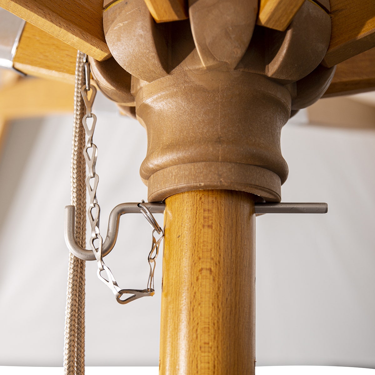 Deze staande parasol heeft een klassiek design en zal in iedere tuin een goede match vormen met de andere tuinmeubels. Zowel de stok als de 8 baleinen zijn gemaakt van beukenhout en hebben een naturel houtkleur. De parasoldoek is gemaakt van polyester en heeft een witte kleur. De Sonn parasol opent door middel van een katrolsysteem en heeft een diameter van 3 meter. Hierdoor is deze grote parasol ideaal om schaduw boven de tuintafel te creëren. De natuurlijke en warme uitstraling zorgt ervoor ervoor dat een gezellige en zomerse sfeer ontstaan in de tuin. Let op: de parasol wordt zonder parasolvoet en hoes geleverd.