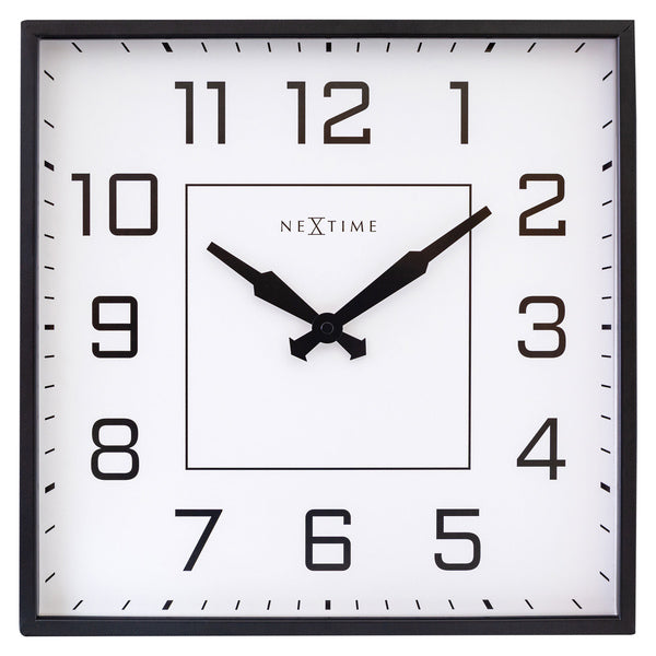 NeXtime's Be Square (35x35cm) is een vierkante wandklok met een strak design. De klok heeft een elegante zwarte rand en een witte wijzerplaat met en zwarte cijferindex. Het design van deze klok maakt van een alledaagse woonaccesoire een bijzonder pronkstuk!. Deze klok werkt op 1 x AA batterij (niet inbegrepen).