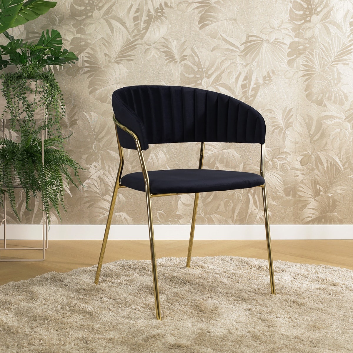 Deze eigentijdse eetkamerstoel heeft een opvallend design maar doet qua comfort ook zeker niet onder. De Alica stoel is ontworpen met een goudkleurig metalen onderstel en een gestoffeerde rugleuning en zitvlak. De donkerblauwe velvet stof zorgt in combinatie met de gouden poten van deze stoel voor een chique uitstraling en voelt ook nog eens erg zacht aan. Het patroon van stiksel op de rugleuning zorgt voor de finishing touch in het chique design. Deze eetkamerstoel zit erg comfortabel dankzij het gestoffeerde zitvlak en de gebogen rugleuning. Lang natafelen is met de Alicia eetkamerstoel dus zeker geen straf.