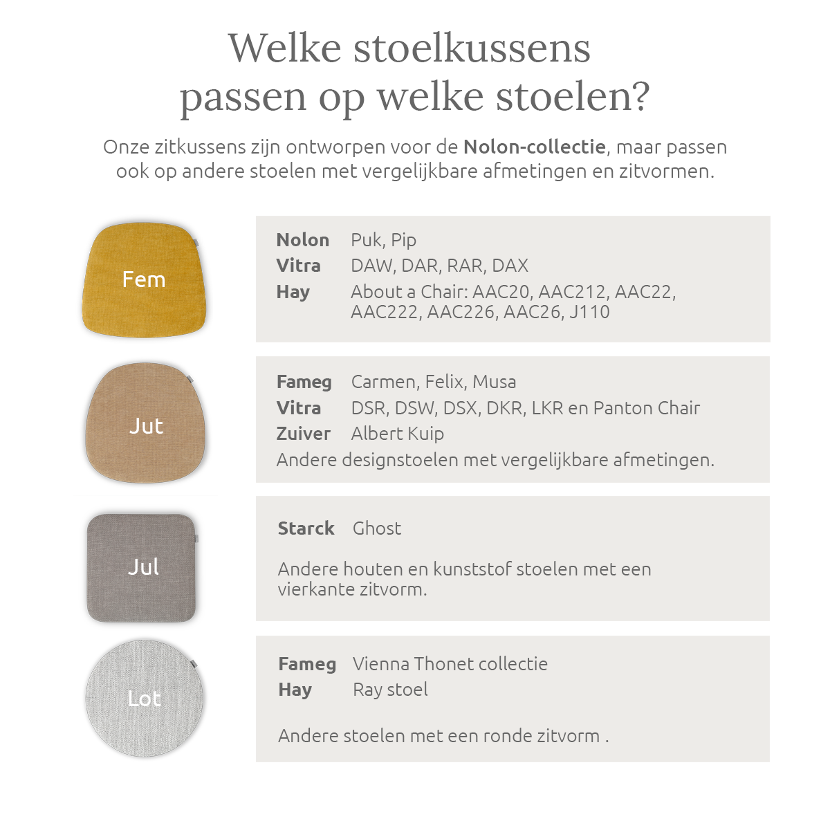 Je kunt het Fem kussen krijgen in allerlei kleuren en stoffen – van zachte stof tot bouclé en zelfs teddystof. Zo is er altijd wel een uitvoering die matcht met jouw interieur. Toch liever een andere vorm? Dan is er nog het ronde Lot zitkussen of het vierkante Jul kussen. Wil je iets dat wat ronder aansluit dan de Fem, dan is het Jut zitkussen een mooie optie.