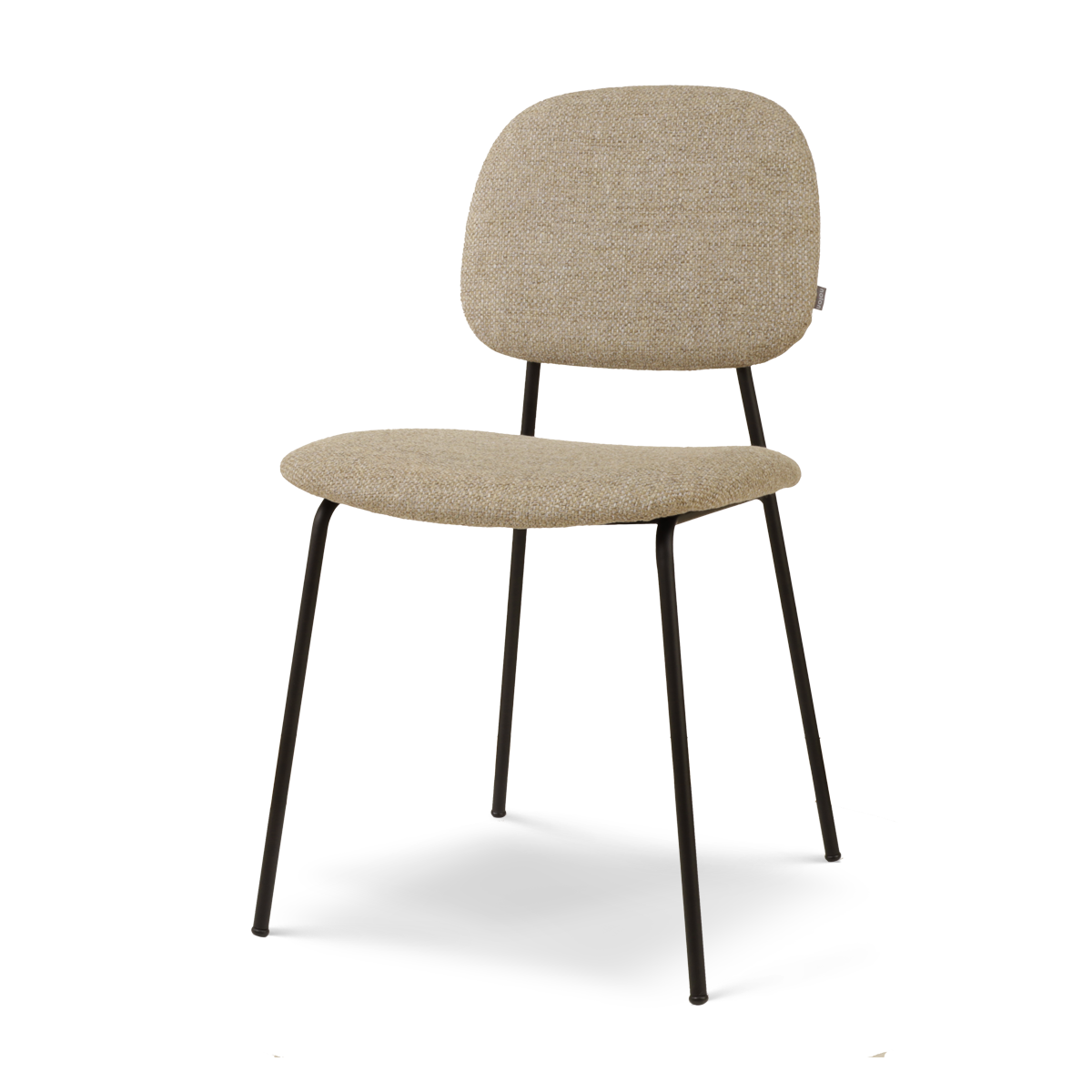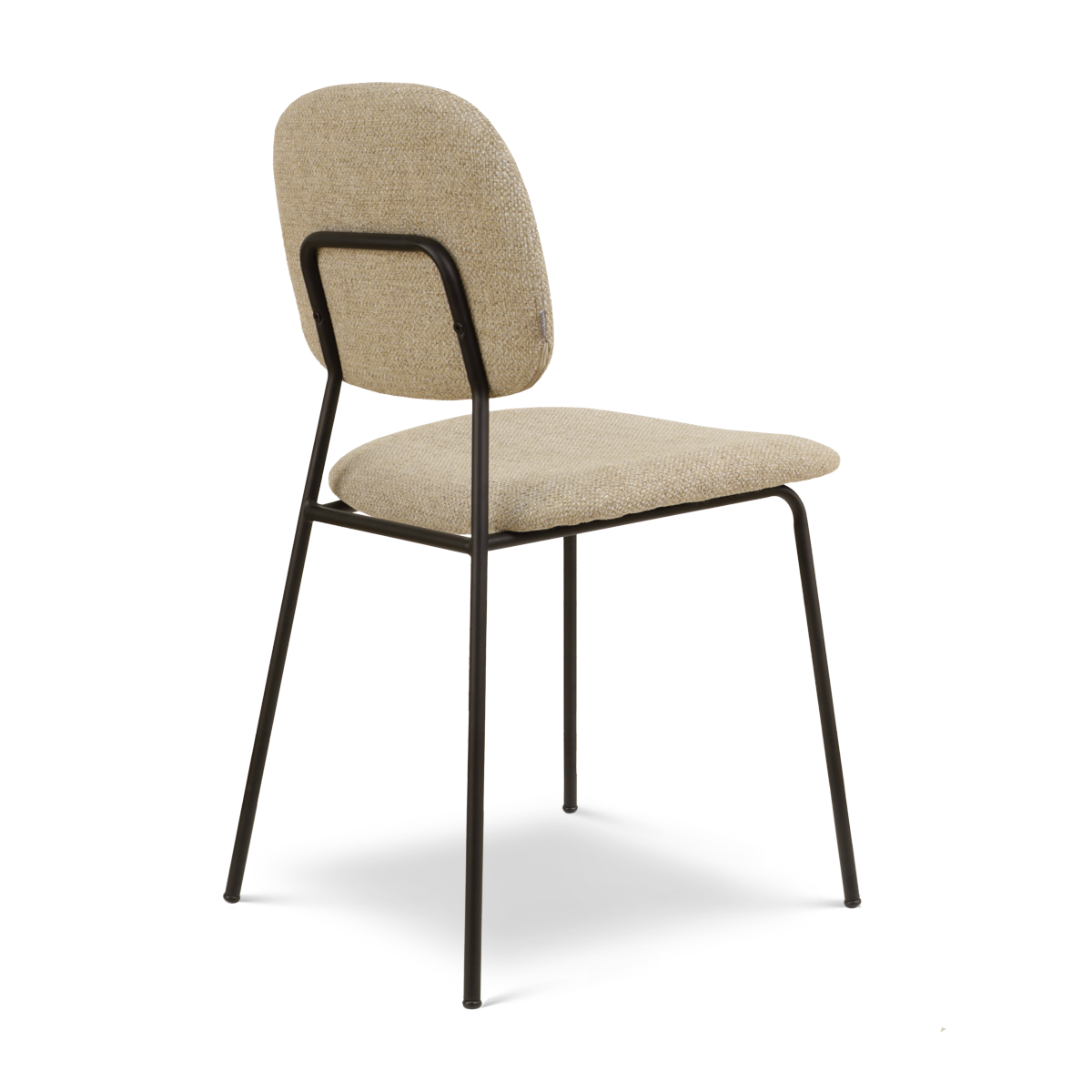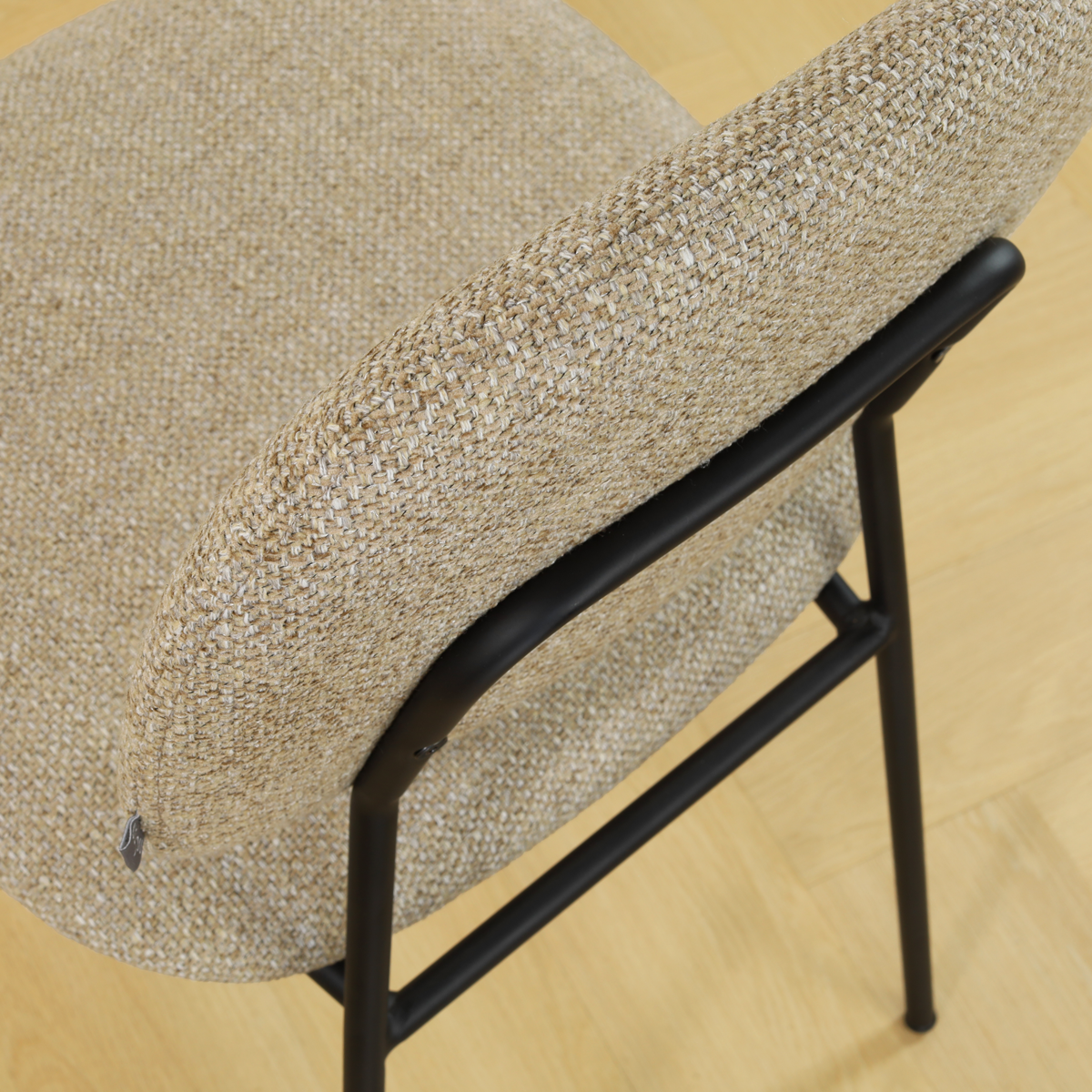 Een tijdloze eetkamerstoel in taupe stof, afgewerkt met een slank zwart onderstel. Subtiel, elegant en makkelijk te combineren.