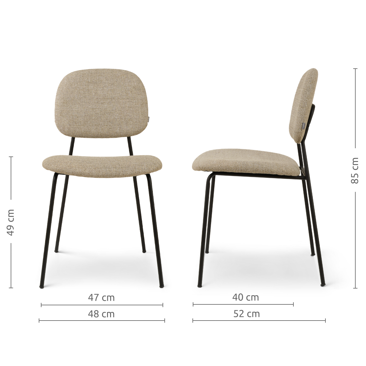 De onderhoudsvriendelijke stof blijft lang mooi en de stoel voelt stevig aan. Deze kleur past moeiteloos bij diverse interieurstijlen, van Scandinavisch tot Japandi en modern industrieel.