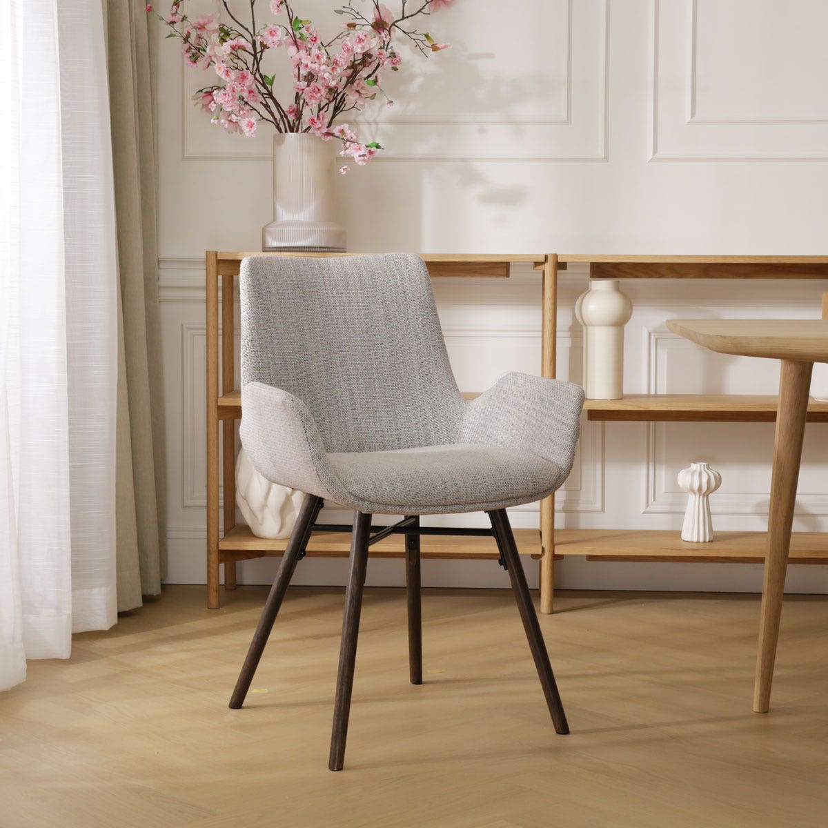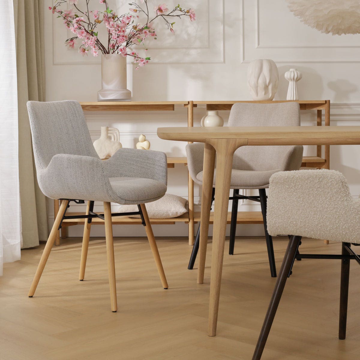 Of je nu een moderne, japandi of een meer klassieke stijl nastreeft, deze luxe eetkamerstoel past naadloos in diverse interieurs. De zitting van de Nena-Eef eetkamerstoel is bekleed met een rijke beige gemêleerde stof en de eikenhouten poten zijn voorzien van een walnoot kleur finish, wat zorgt voor een warme en stijlvolle uitstraling. Deze eetkamerstoel is bovendien ontworpen met armleuningen en een hoge rugleuning, waardoor het zitcomfort hoog is. Dankzij de iets lagere armleuningen dan gemiddeld, past deze armstoel toch zorgeloos onder de meeste eettafels, terwijl je van een ontspannen zithouding geniet. Dit maakt de Nena-Eef de ideale stoel voor gezellige diners en urenlang natafelen met vrienden en familie.
