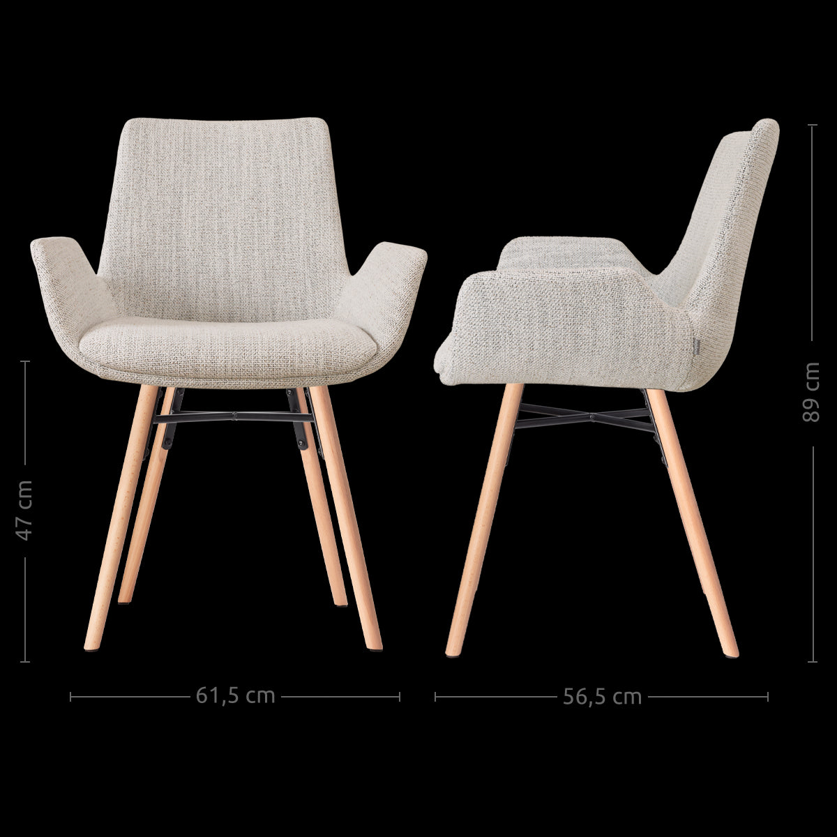 De zitting van de Nena-Eef eetkamerstoel is bekleed met beige gemêleerde stof en de beukenhouten poten hebben een naturel houtkleur, wat samen zorgt voor een warme en stijlvolle uitstraling. Deze moderne eetkamerstoel is bovendien ontworpen met armleuningen en een hoge rugleuning, waardoor het zitcomfort hoog is. Dankzij de iets lagere armleuningen past deze armstoel toch zorgeloos onder de meeste eettafels, terwijl je van een ontspannen zithouding geniet. Dit maakt de Nena-Eef de ideale stoel voor gezellige diners en urenlang natafelen met vrienden en familie. Net als andere beige eetkamerstoelen is de Nena-Eef gemakkelijk te combineren in je interieur, of je nu houdt van een moderne, Scandinavische of klassieke woonstijl.