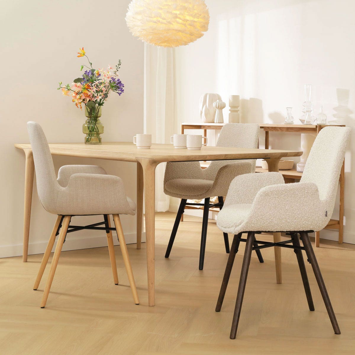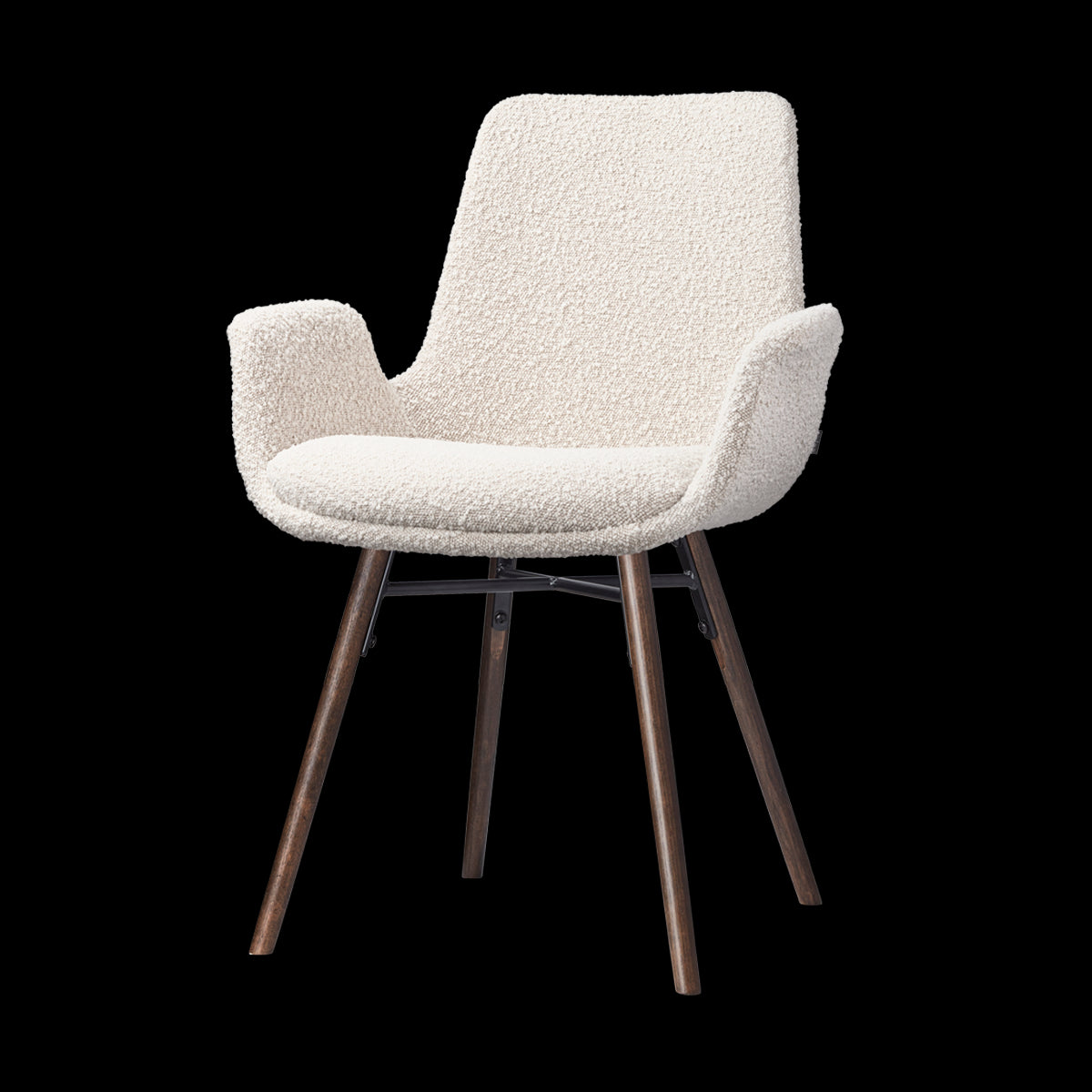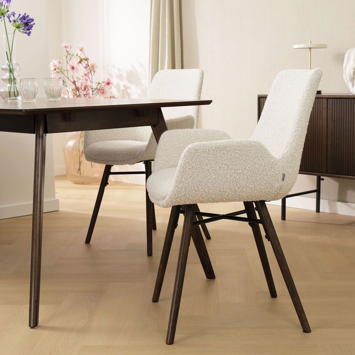 Of je nu een minimalistische, moderne inrichting of een meer traditionele stijl nastreeft, deze luxe eetkamerstoel past naadloos in diverse interieurs. De zitting van de Nena-Eef eetkamerstoel is bekleed met bouclé of luxe stof en de eikenhouten poten zijn voorzien van een walnoot kleur, wat zorgt voor een warme en stijlvolle uitstraling. Deze eetkamerstoel is bovendien ontworpen met armleuningen en een hoge rugleuning, waardoor het zitcomfort hoog is. Dankzij de iets lagere armleuningen past deze armstoel toch zorgeloos onder de meeste eettafels, terwijl je van een ontspannen zithouding geniet. Dit maakt de Nena-Eef de ideale stoel voor gezellige diners en urenlang natafelen met vrienden en familie.