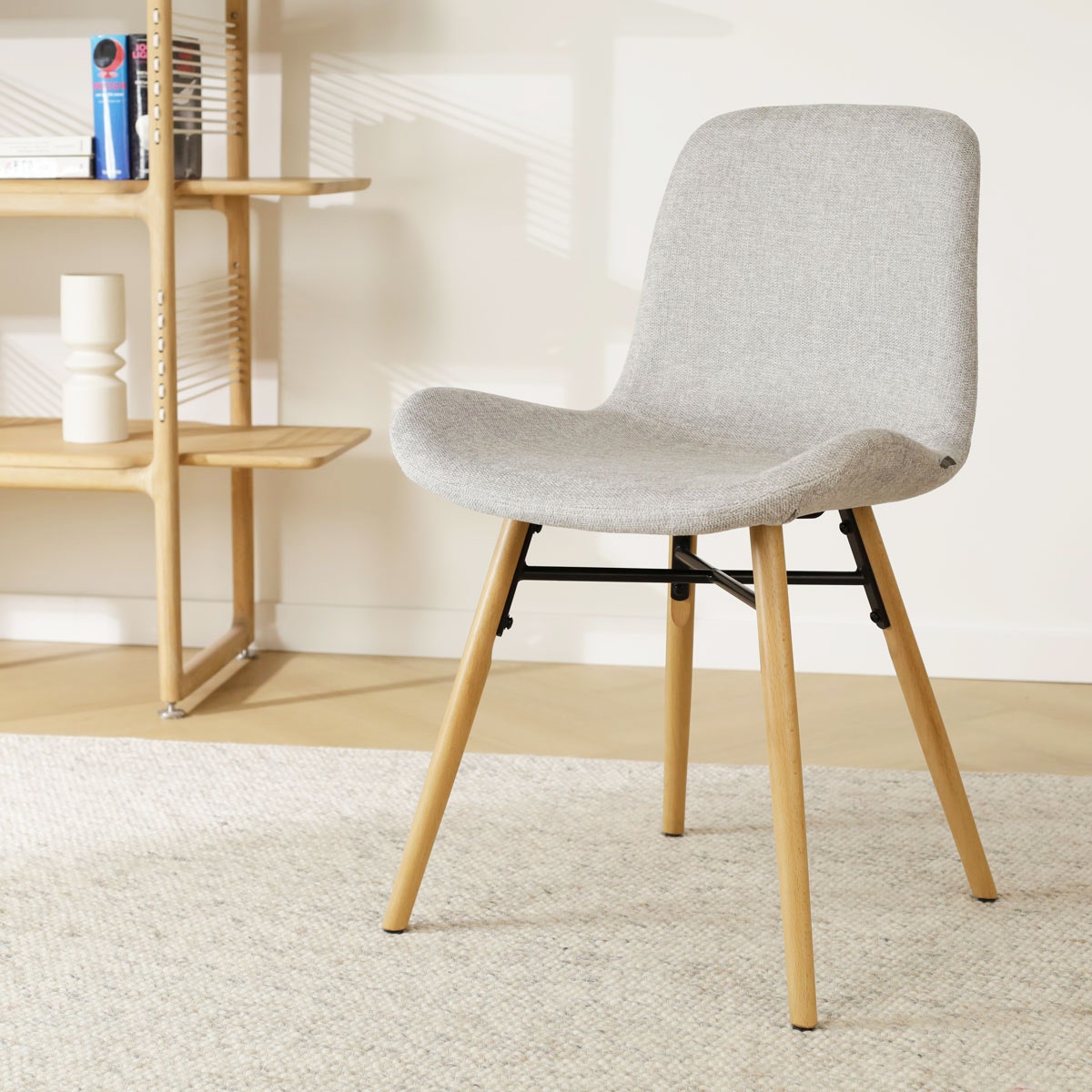 Deze eetkamerstoel combineert een prachtig houten onderstel met een elegante gestoffeerde zitting voor een gezellige uitstraling rond de eettafel. De poten van deze stoel zijn gemaakt van beukenhout en hebben een zwarte metalen kruisverbinding voor extra stabiliteit. Deze eetkamerstoel heeft een zitting van stof met een gevleugeld zitvlak, wat een zacht en comfortabel oppervlak biedt om op te zitten. Net als andere eetkamerstoelen zonder armleuningen geeft de Nena-Fé je de vrijheid je stoel gemakkelijk onder de eettafel te schuiven. Met de acht beschikbare kleuropties voor de stoffen bekleding past deze stoel in alle woonstijlen, van modern tot Scandinavisch en klassiek. Kies jouw favoriet en zet die gezellige diners maar vast in de agenda!