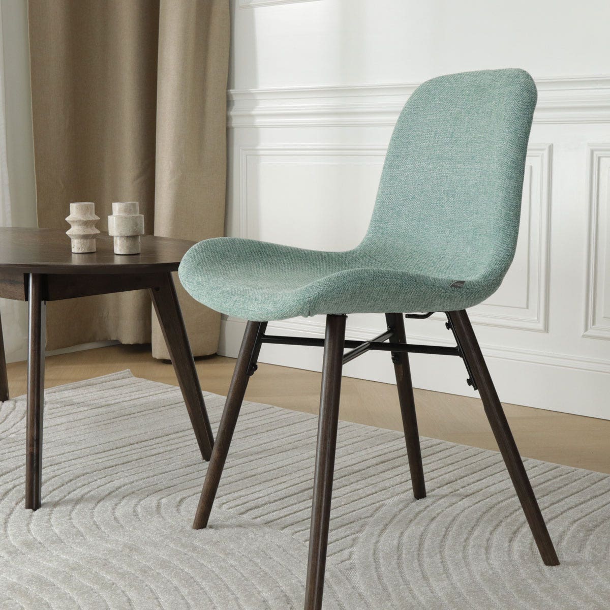 Het tijdloze design van deze eetkamerstoel combineert hout en stof op een uiterst stijlvolle manier, waardoor deze stoel moeiteloos past in zowel moderne als klassieke interieurs. Het stevige onderstel is gemaakt van hoogwaardig eikenhout, waardoor stabiliteit en duurzaamheid gegarandeerd zijn. De walnoot kleur van het hout voegt een warme en authentieke uitstraling toe aan je eetkamer. Deze eetkamerstoel heeft een zitting van stof met een gevleugeld zitvlak, wat een zacht en comfortabel oppervlak biedt om op te zitten. Net als andere eetkamerstoelen zonder armleuningen geeft de Nena-Fé je de vrijheid je stoel gemakkelijk onder de eettafel te schuiven. Kies uit een assortiment van prachtige kleuren en verschillende materialen voor de stoffen bekleding, waaronder teddystof, ribstof en bouclé.
