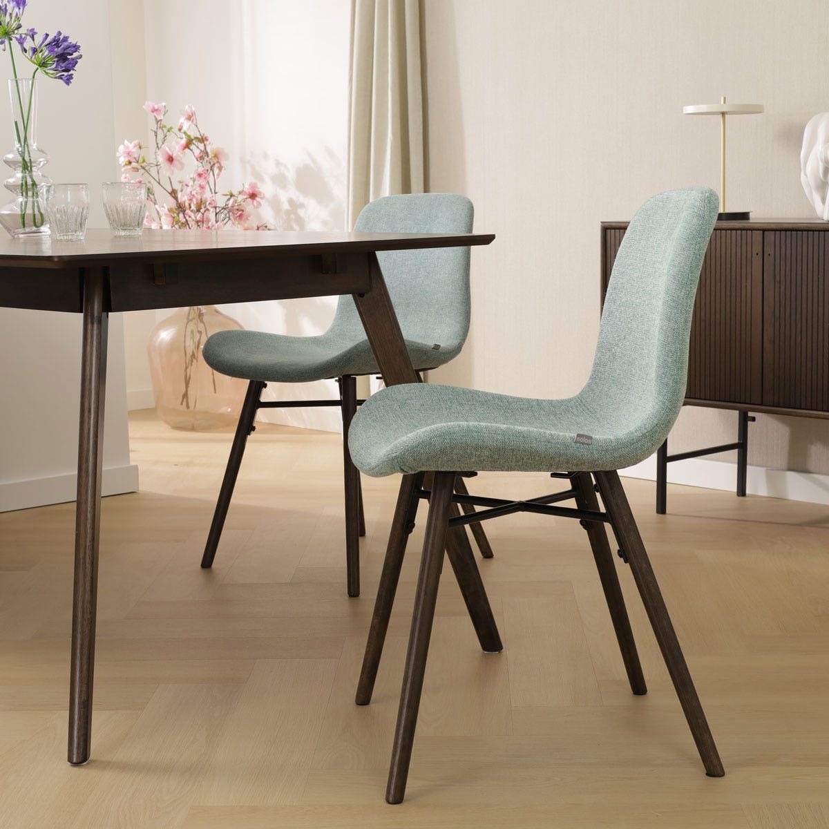 - De donkere walnootkleur van het hout zorgt voor een warme uitstraling in de eethoek