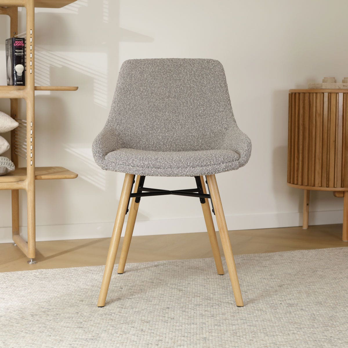 Deze stoel combineert de warme uitstraling van de bouclé stof met de natuurlijke charme van bruine houten poten, wat een uitnodigende sfeer creëert in uw interieur. De zitting, volledig gestoffeerd in luxe bouclé stof, is ergonomisch ontworpen voor een comfortabele zitervaring, terwijl het stevige houten binnenwerk een actieve zithouding bevordert. Met een zithoogte van 47 cm en een zitdiepte van 40 cm, biedt deze stoel voldoende ruimte om comfortabel te dineren. De stoel heeft geen armleuningen, waardoor hij gemakkelijk onder elke tafel past en optimaal gebruik van de ruimte mogelijk maakt. Het Scandinavische en Japandi design maakt deze stoel een veelzijdige keuze voor diverse interieurstijlen. Met een hoogte van 86,5 cm en zeer eenvoudig in elkaar te zetten, is de Nena-Isa eetkamerstoel een praktische en stijlvolle toevoeging aan uw eetkamer.